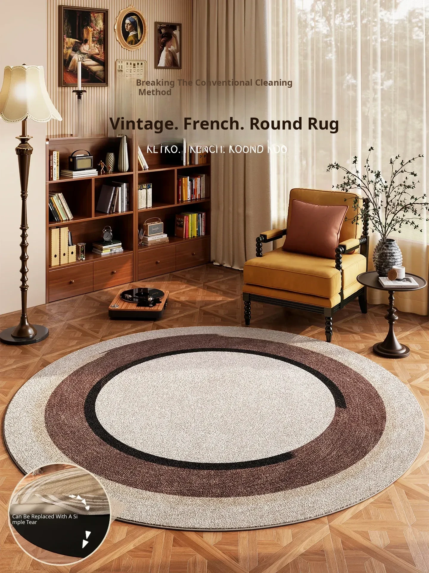 Luxury Round Area Rug for Vintage Living Room - Removable and Washable Carpet Under Sofa, Retro Style Floor Mat, Perfect for Chic Home Décor