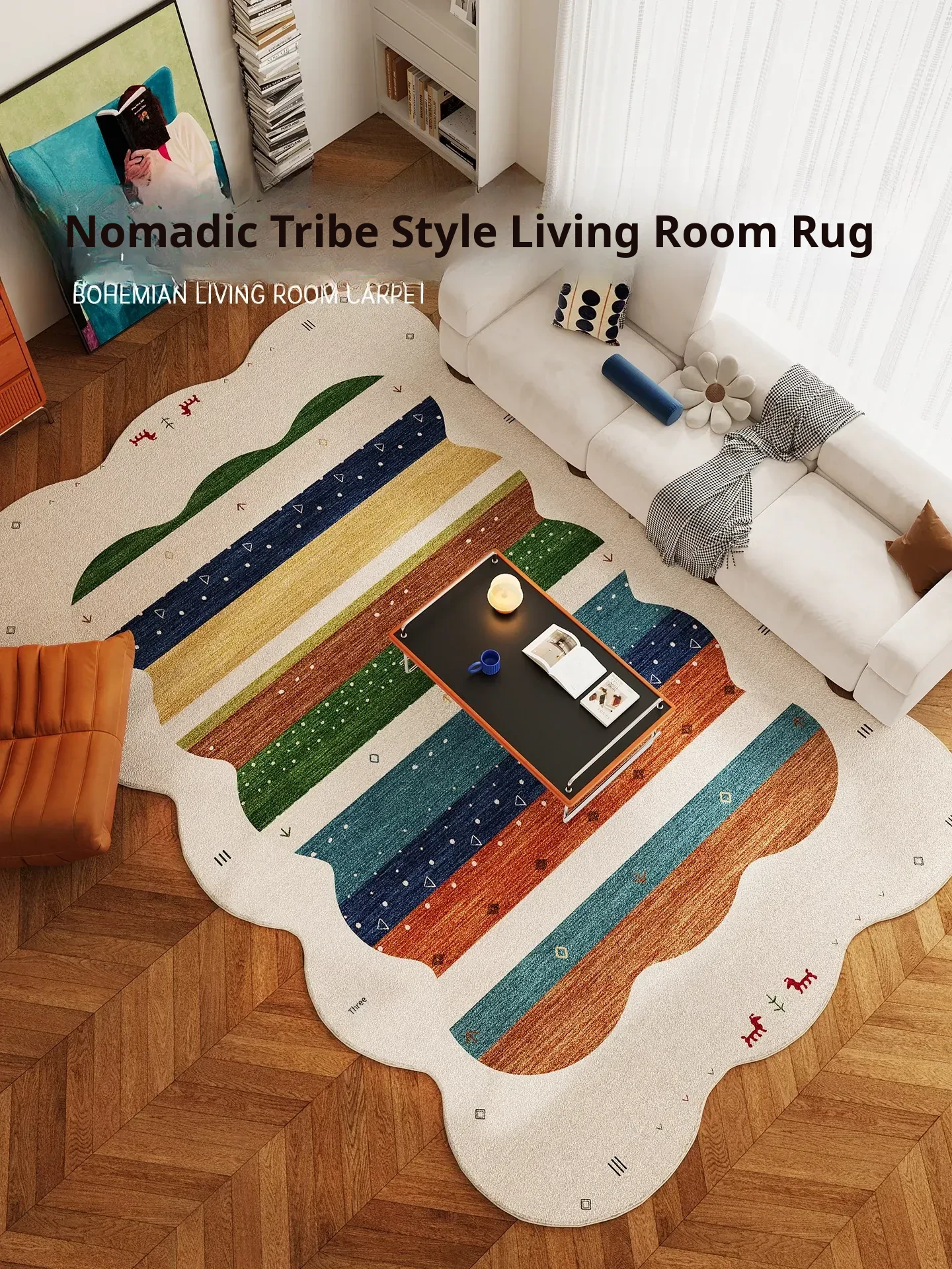 Bohemian Area Rug - Vintage-Inspired Irregular Shaped Sofa Mat for Living Room, Retro Plush Bedroom Bedside Carpet, Unique Design Floor Mat