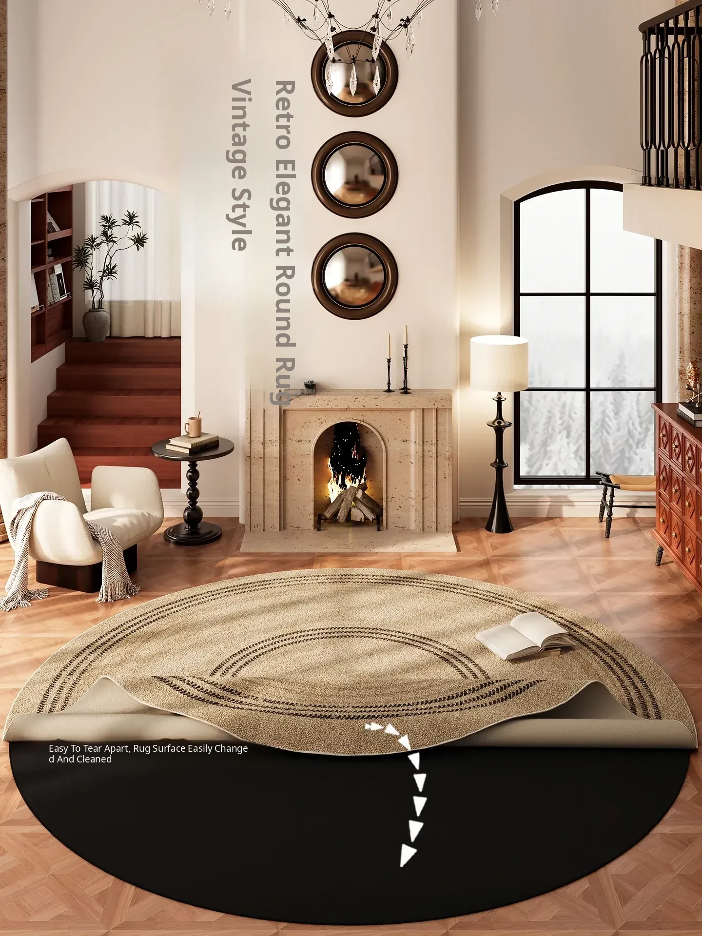 Vintage Round Area Rug - Machine Washable Retro Carpet for Living Room Sofa, Removable Bedroom Bedside Mat, Perfect for Cozy Home Decor