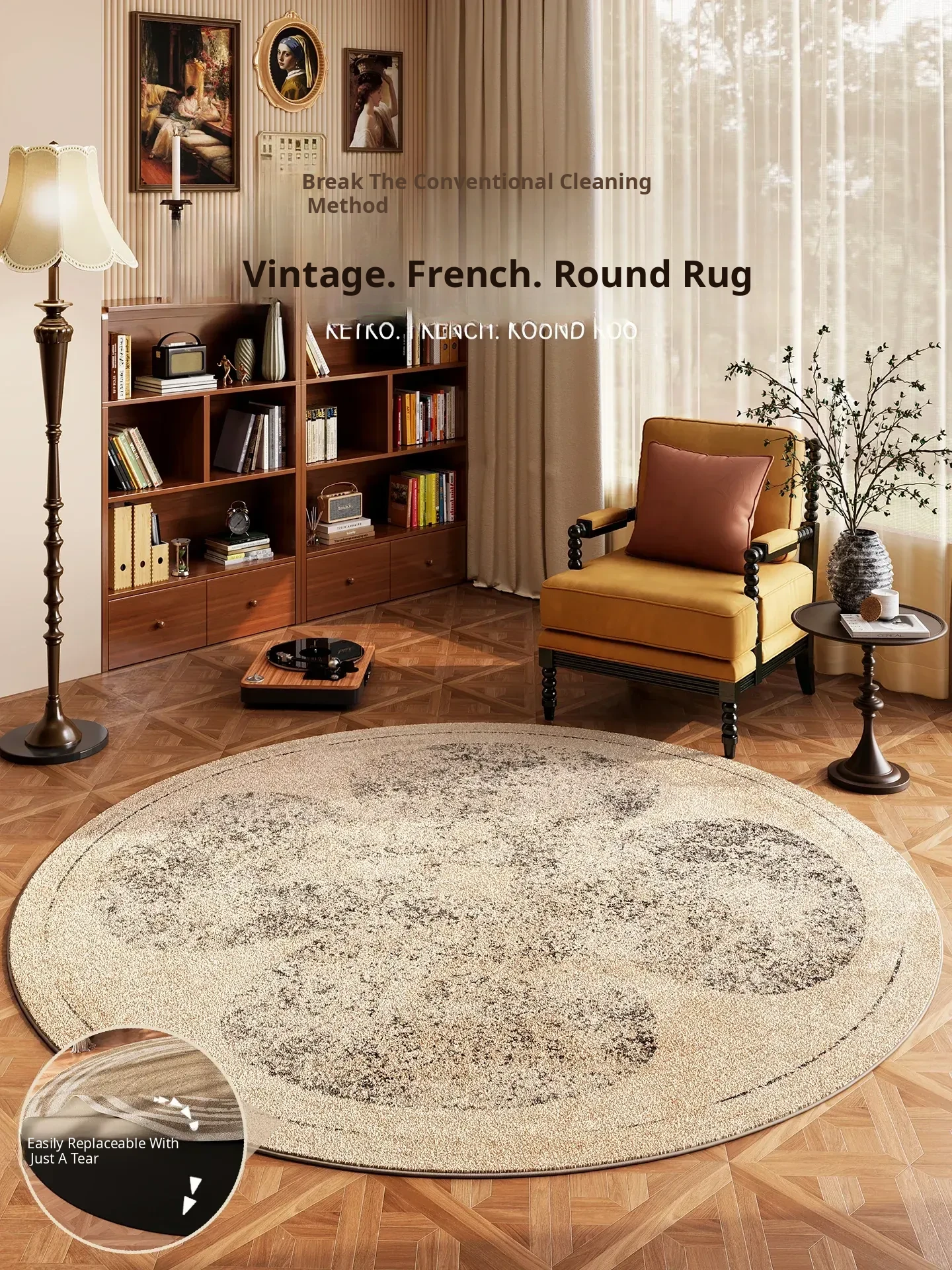 Vintage Round Area Rug for Living Room - Removable Double-Layer Plush Sofa Mat, French Style Washable Bedside Carpet, Perfect for Cozy Interiors