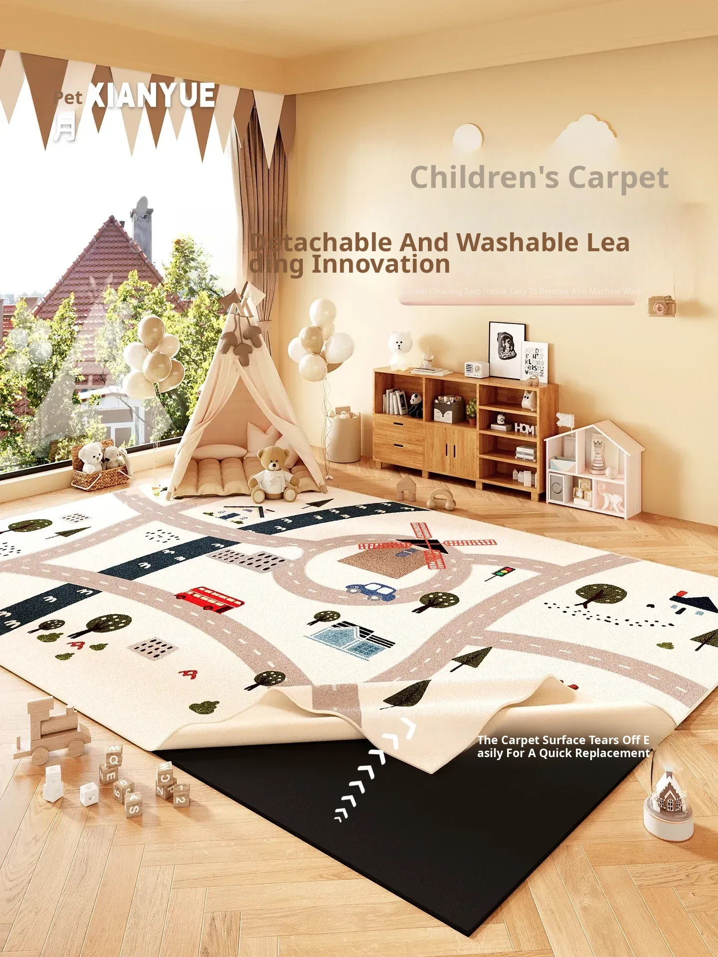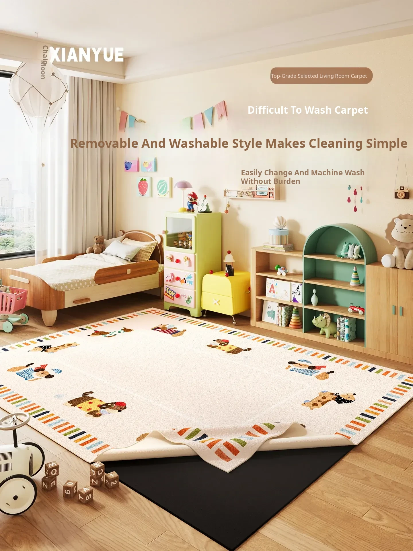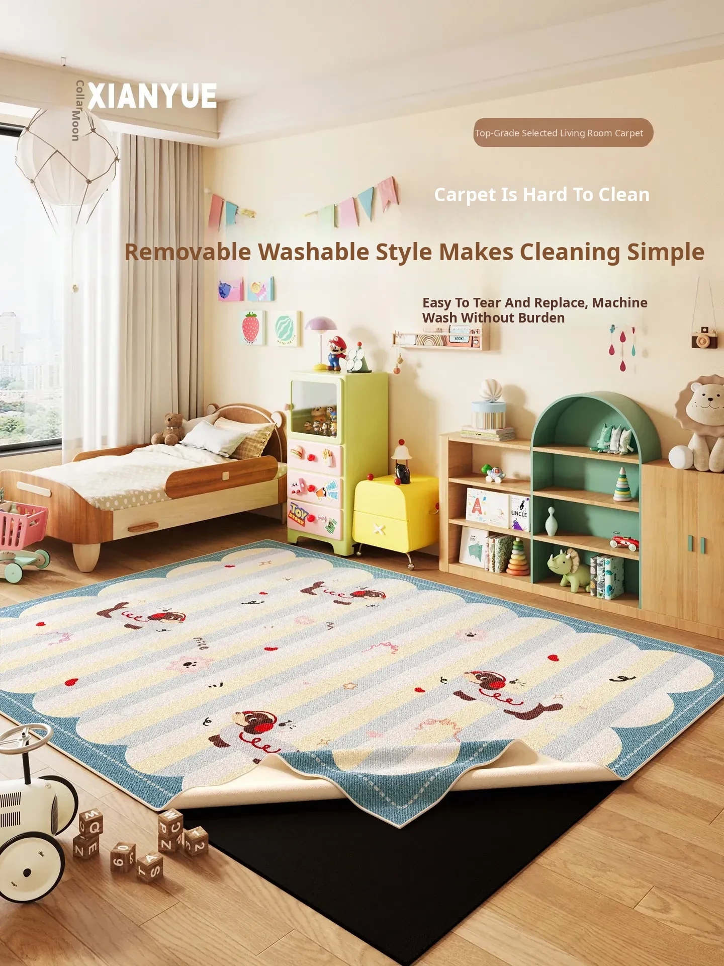 Moon Phase Removable & Washable Carpet for Kids' Room - Double-Layer Anti-Fall Mat, Machine Washable Plush Area Rug, Cartoon Bedside Carpet for Safe Playtime