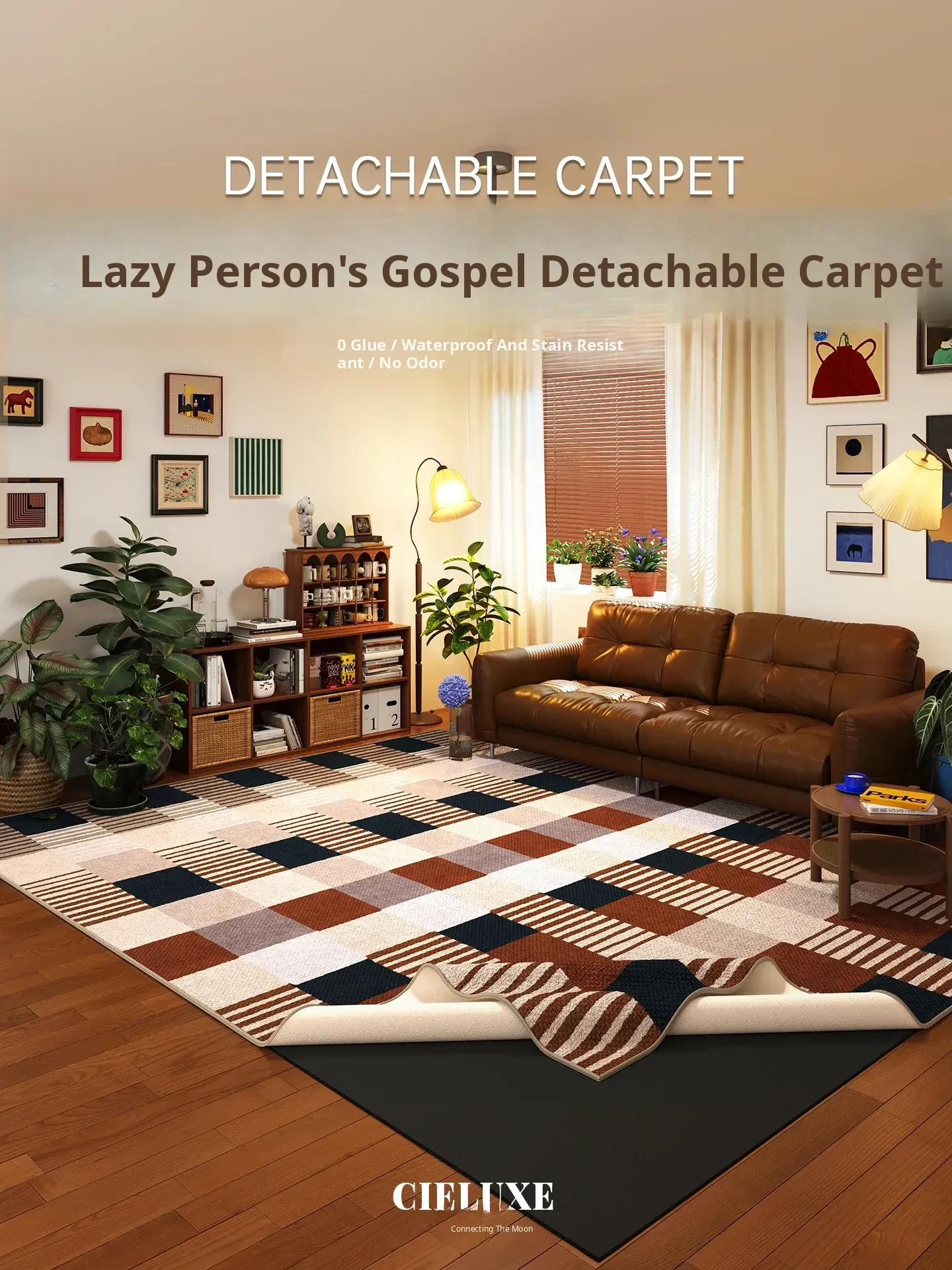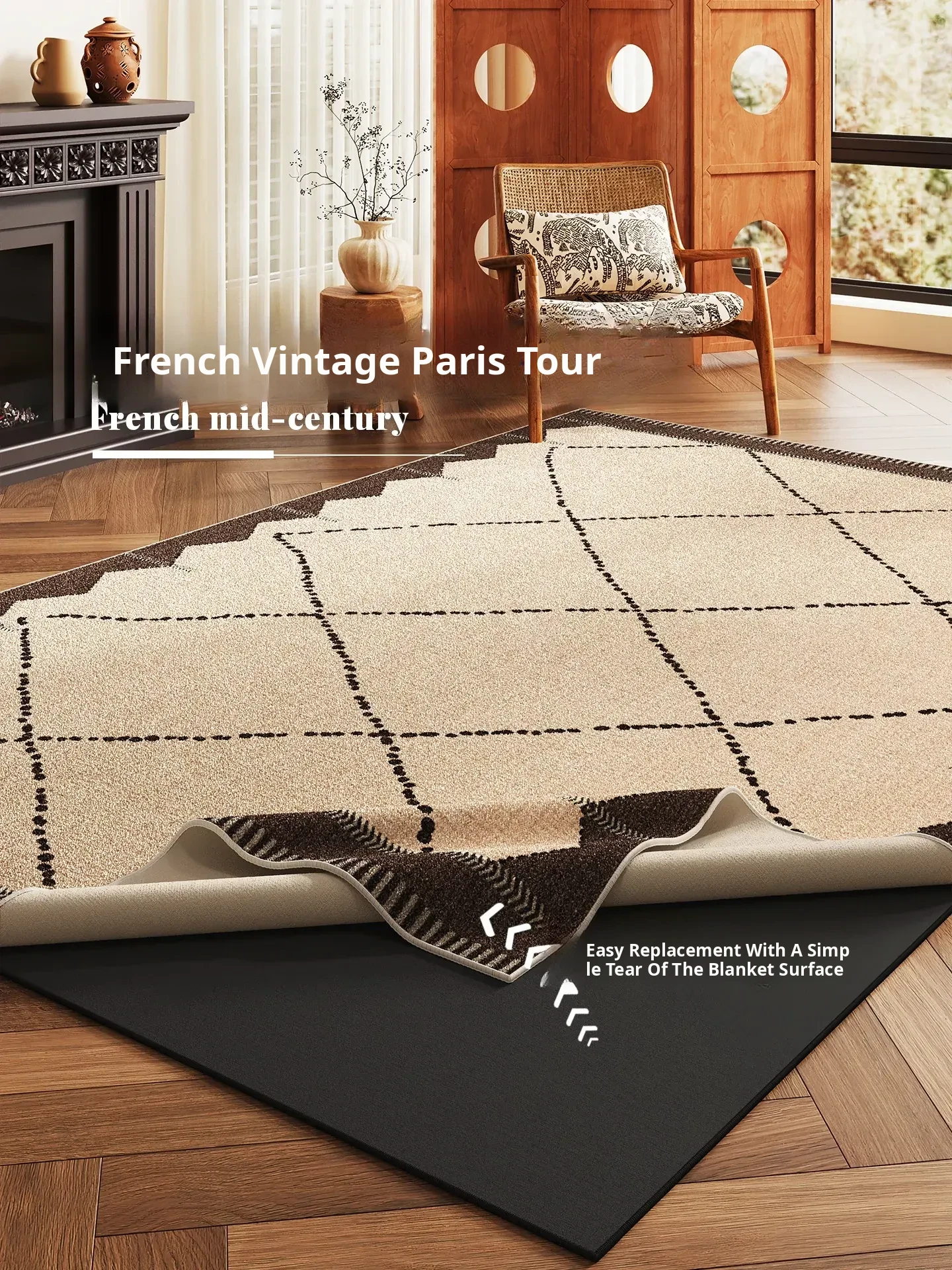 Vintage-Inspired Washable Double-Layer Detachable Carpet for Living Room - French Checkered Home Floor Mat, Easy to Clean and Maintain