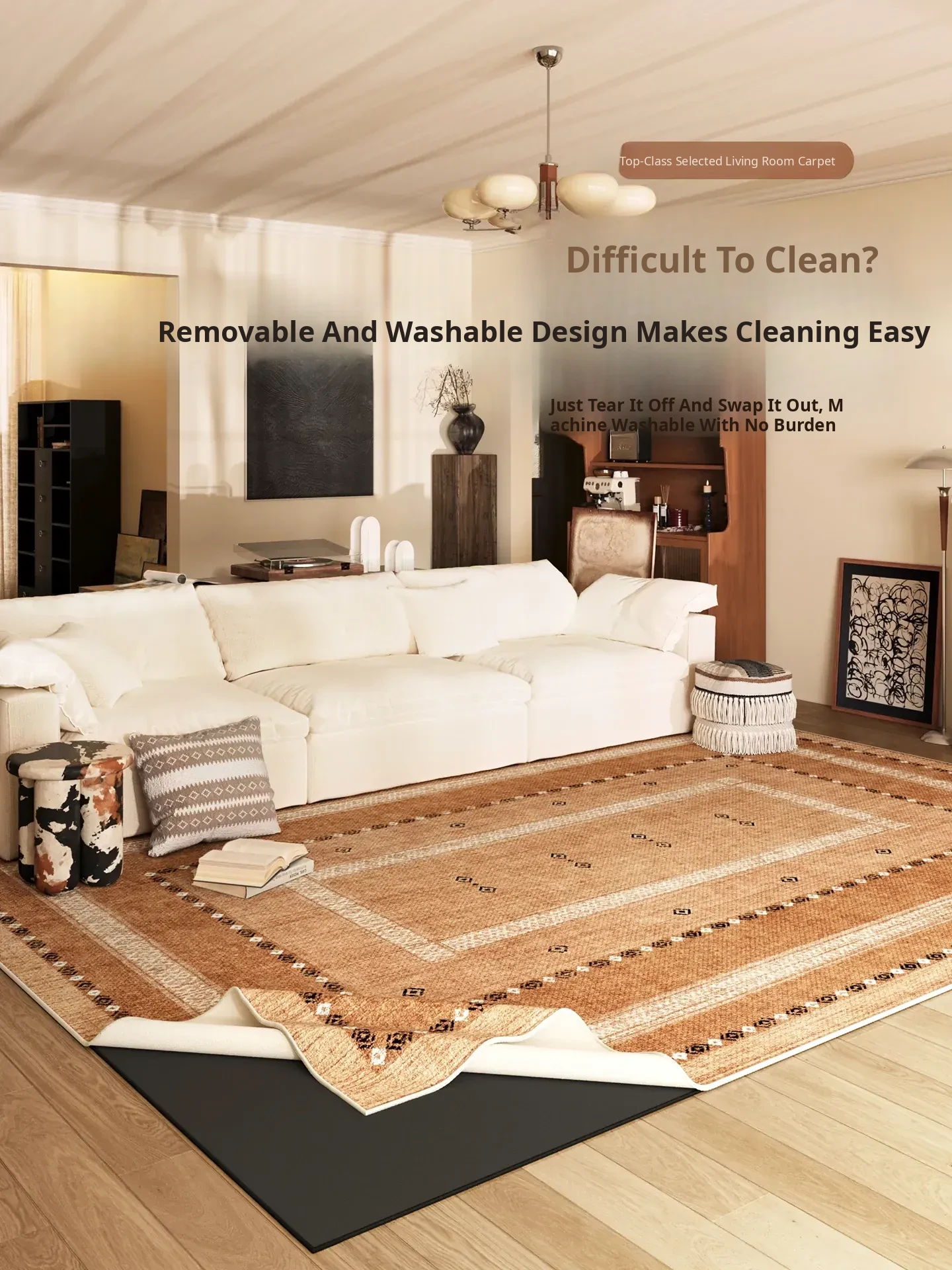 Bohemian Washable Area Rug for Living Room - Double-layer Detachable Carpet Ideal for Sofa and Bedroom, Vintage Style, Easy to Clean, Perfect for Bedside Use