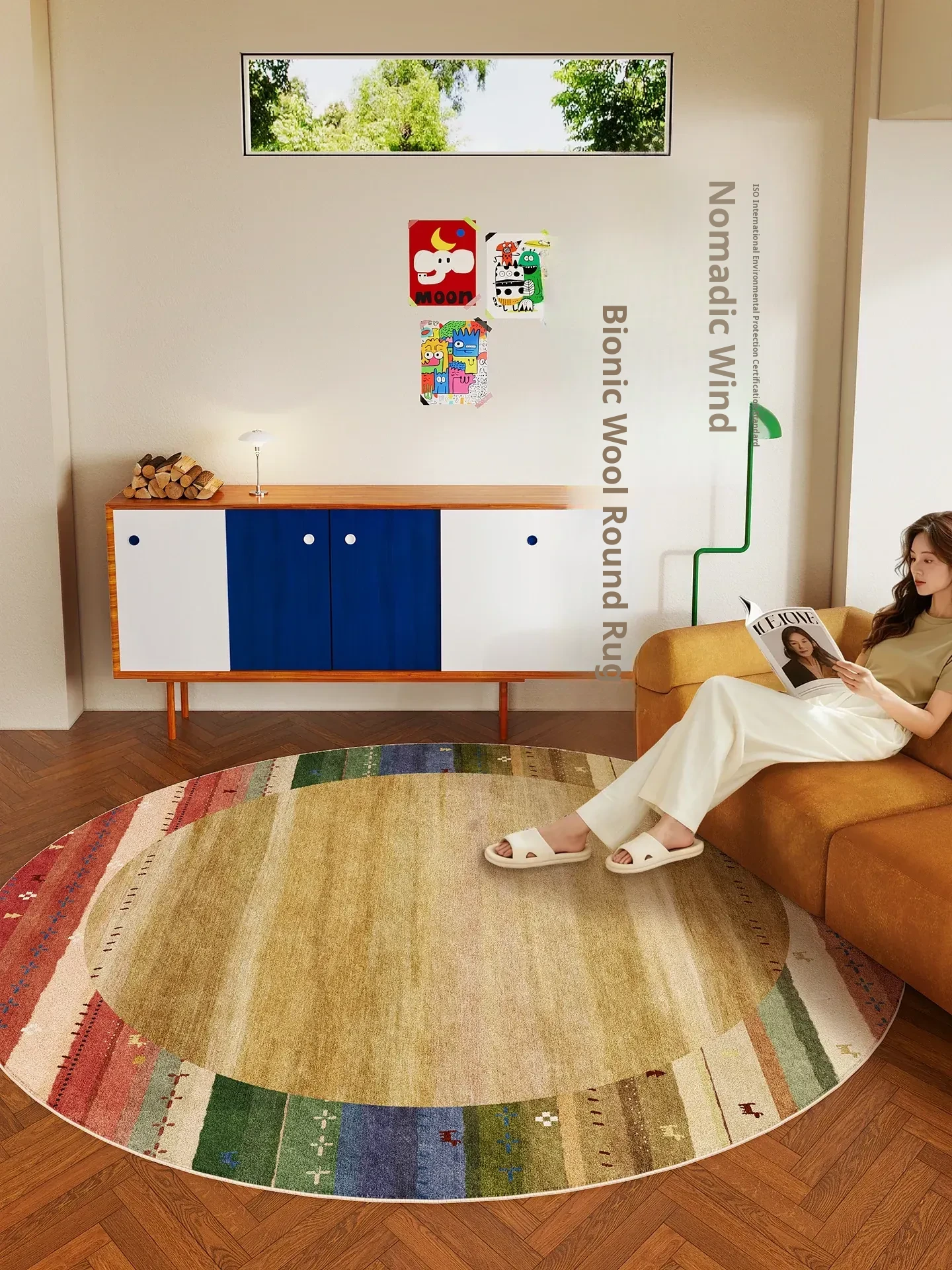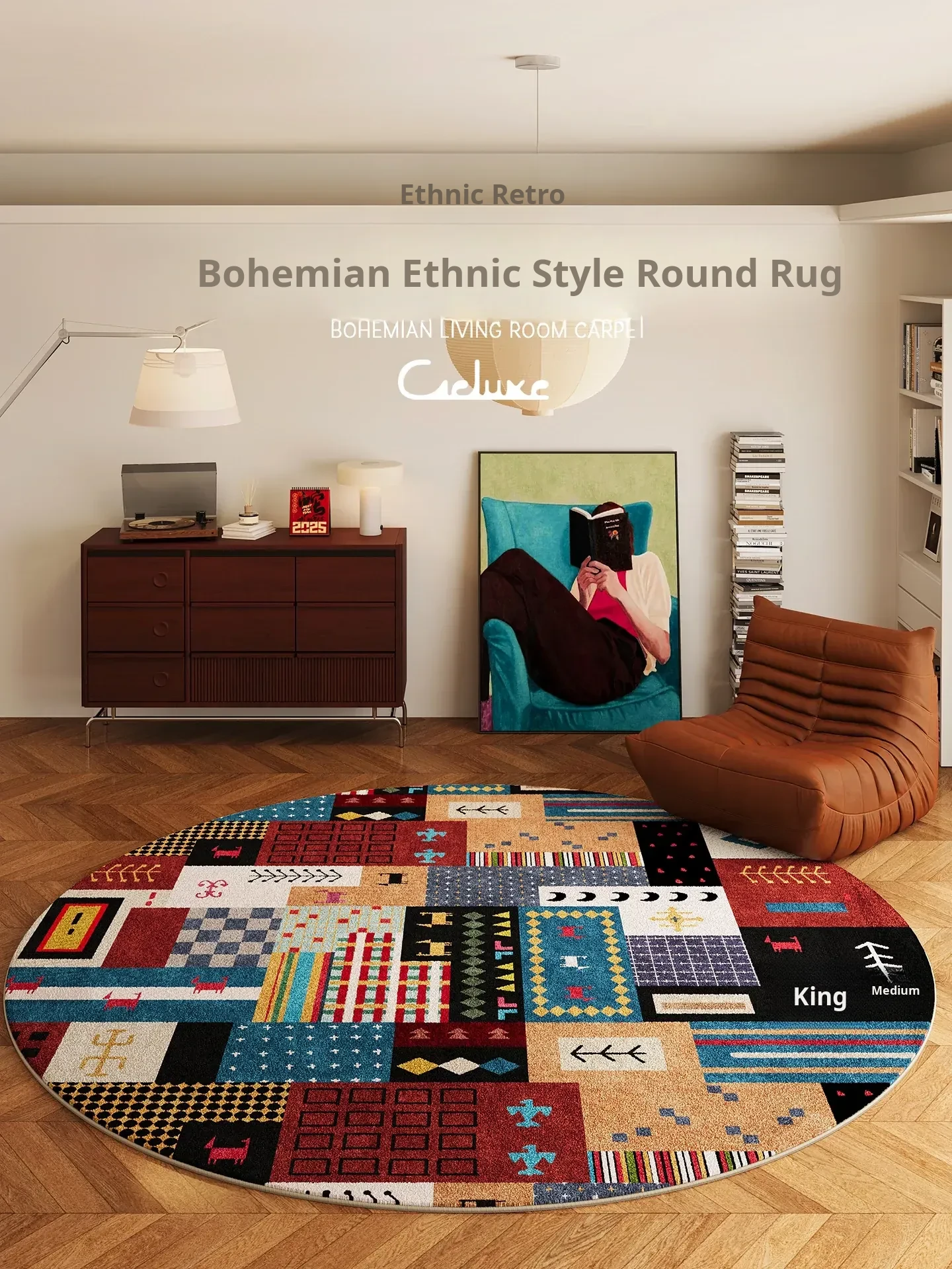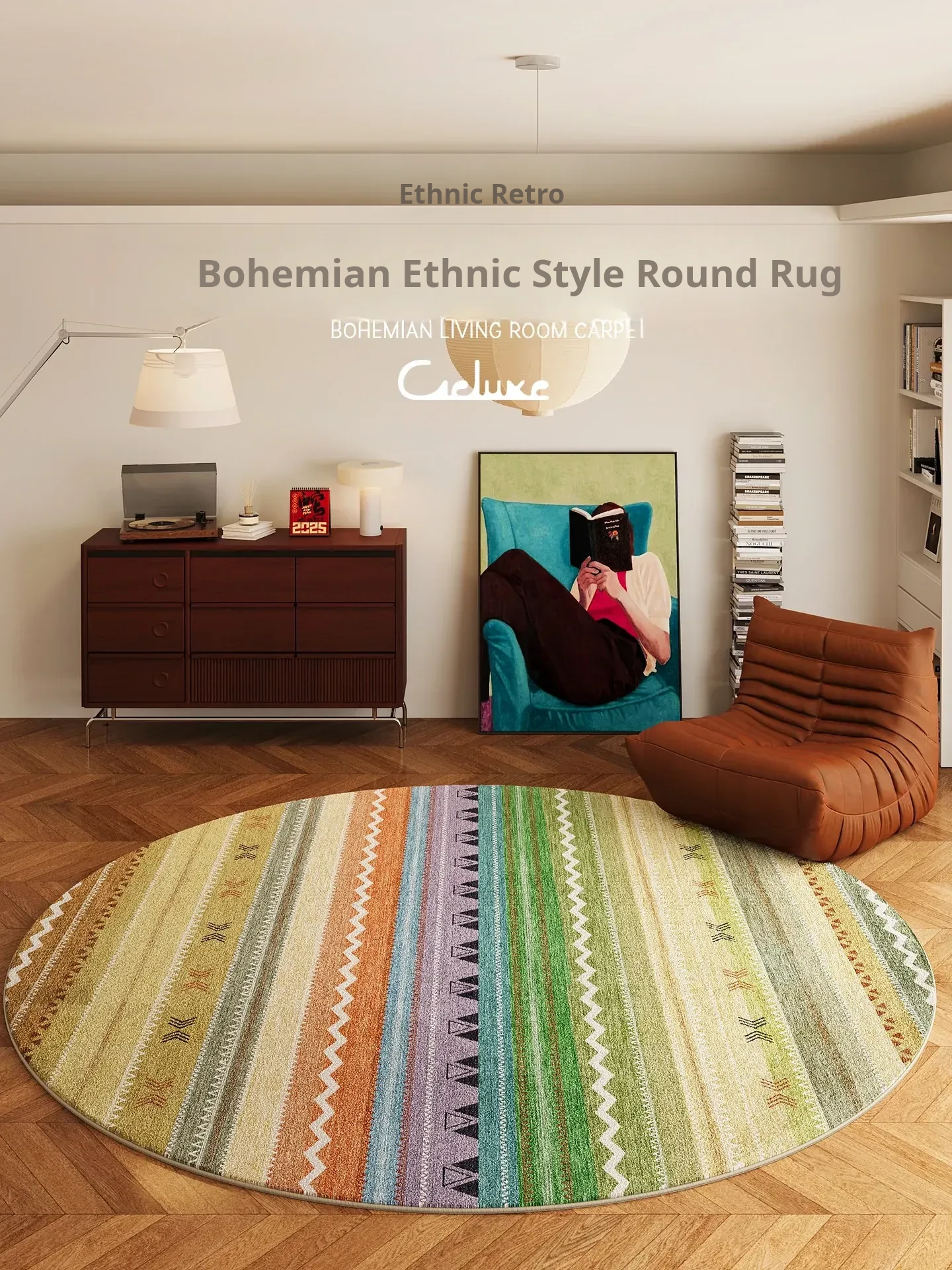 Vintage Round Area Rug for Living Room - Bohemian Sofa Mat, Low-Maintenance Ethnic Style Floor Carpet, Retro Colorful Bedroom Bedside Rug
