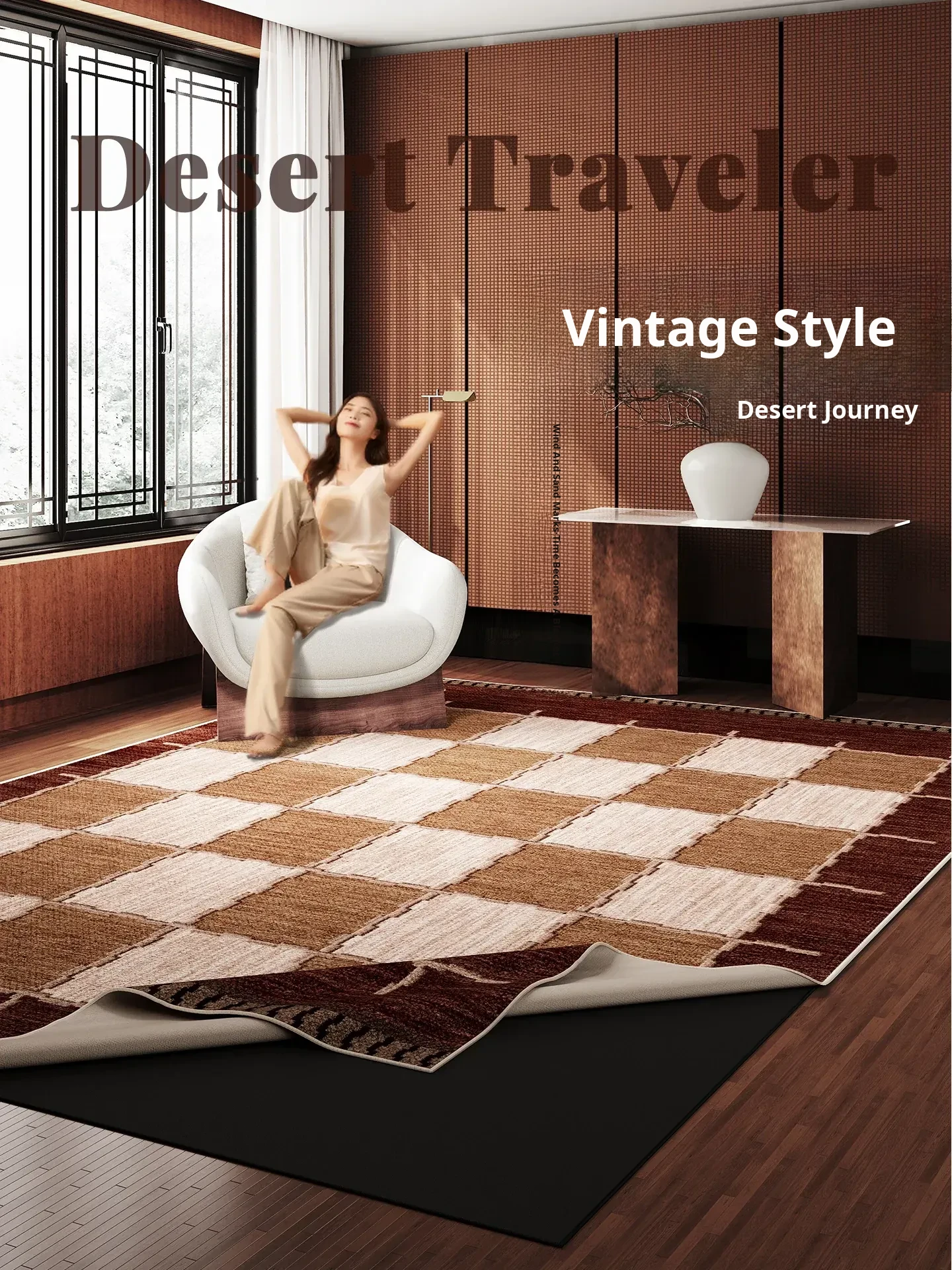 Vintage-Inspired Luxury Carpet for Living Room - Retro Checkered Sofa Mat in Elegant Brown, Perfect for Bedroom and Bedside Décor