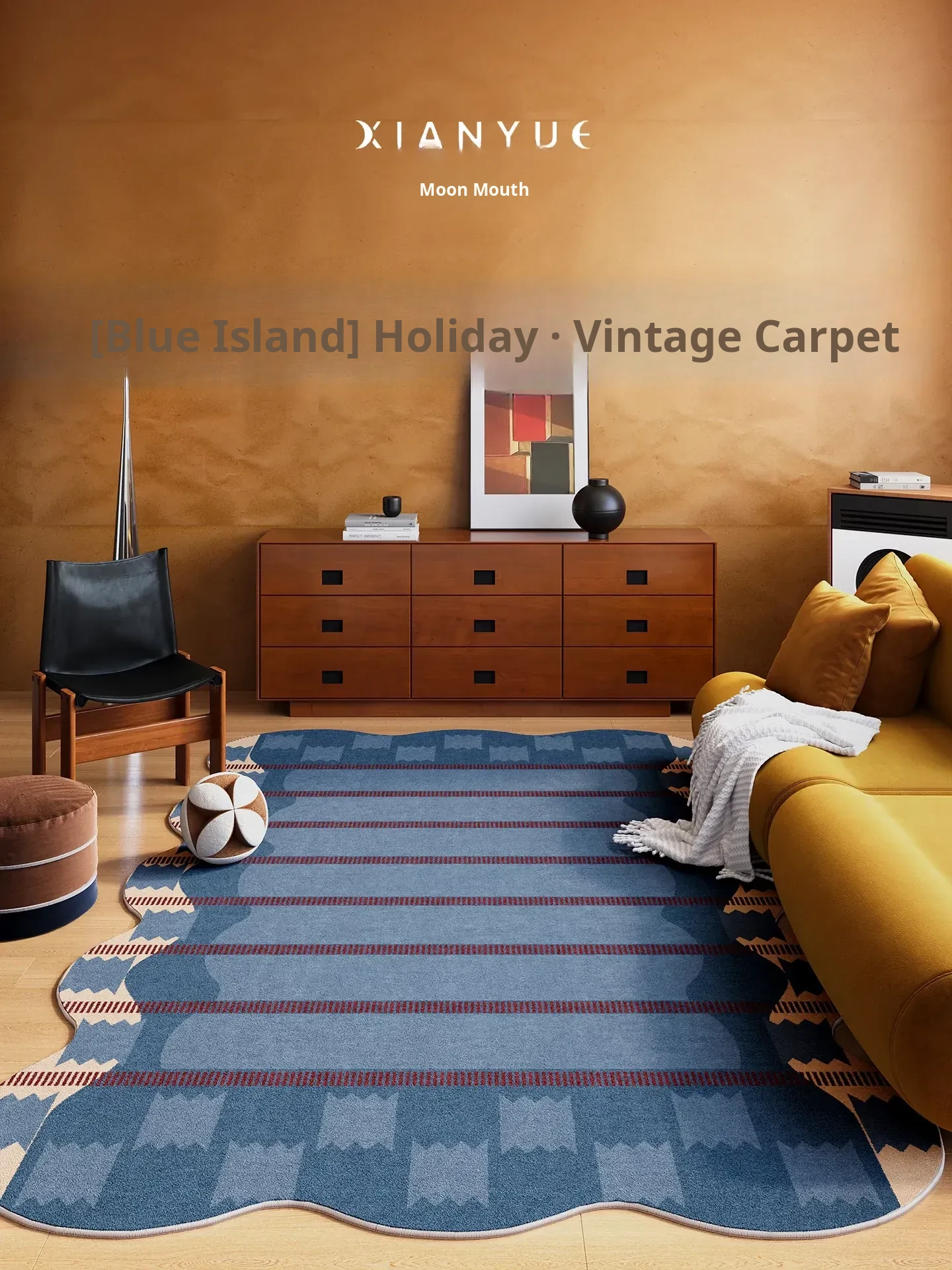 Vintage Blue Crescent Moon Irregular Shaped Carpet - Plush Living Room Sofa Mat, Easy-Clean, Non-Slip Area Rug for a Retro Touch in Your Home