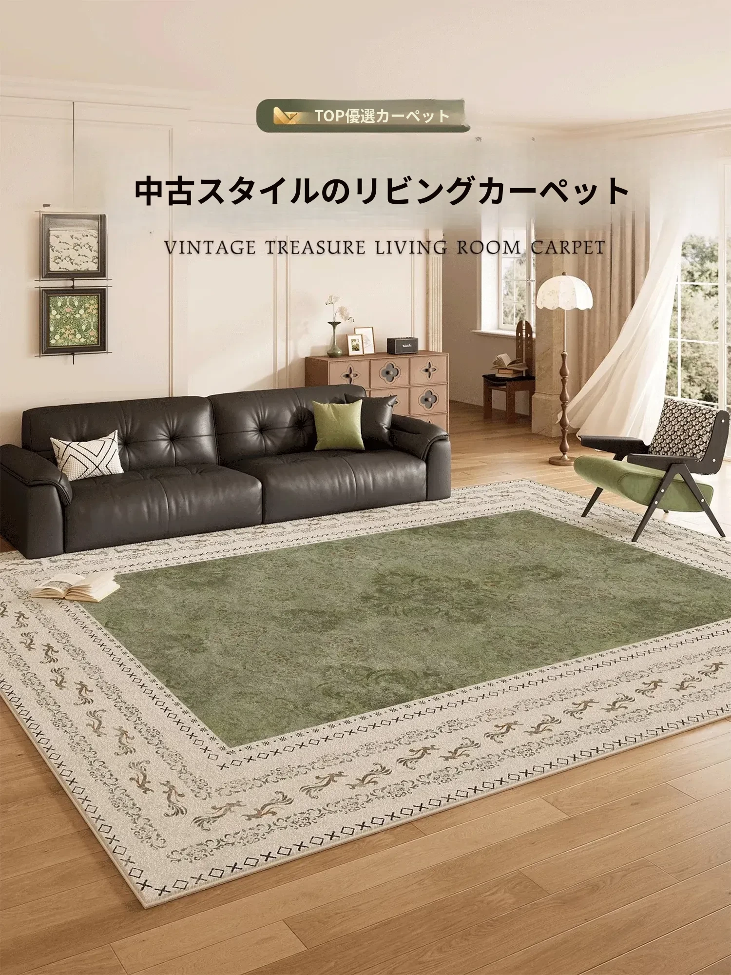2026年新作!レトロな防水・汚れ防止機能付きグリーンカーペット。リビングやベッドサイドに最適なソファマット!おしゃれで快適な空間を演出し、古風な魅力をプラス。