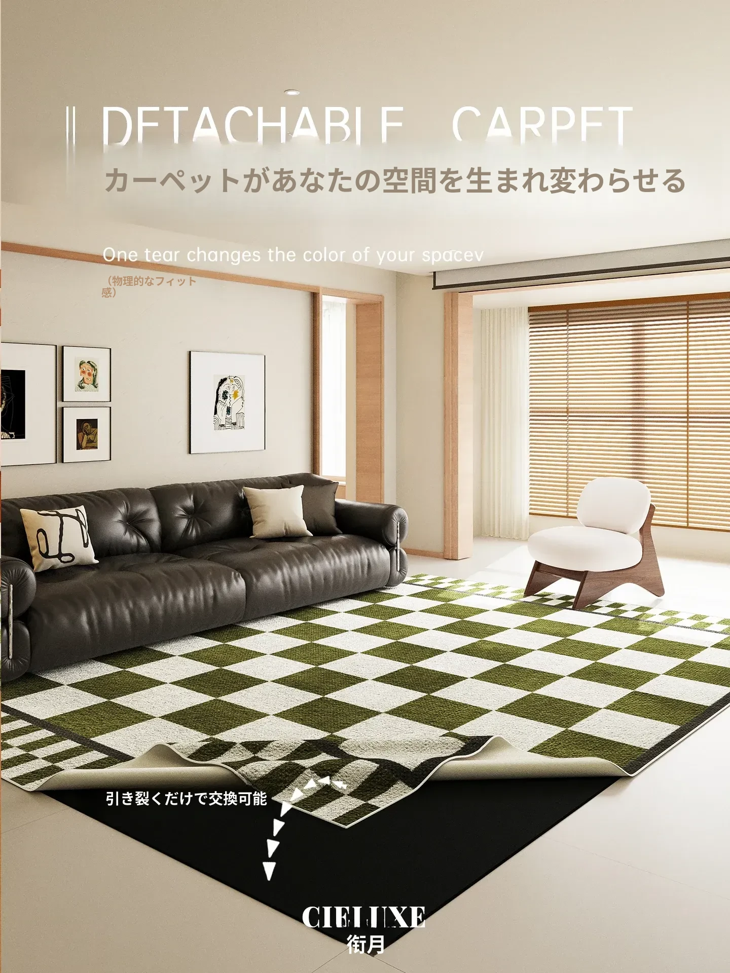 レトロチェック柄のグリーンカーペット - 防水・防汚でお手入れ簡単!リビングやベッドサイドにぴったりなふわふわのマット。おしゃれなバウハウススタイルで、あなたの空間をグレードアップ!