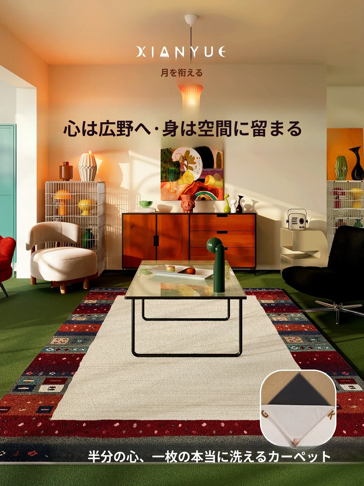 レトロスタイルの洗えるカーペット!リビングソファにぴったりな取り外し可能なデザイン。アンティークな雰囲気で、ベッドサイドにも最適。バウハウス風の洗練された一品。