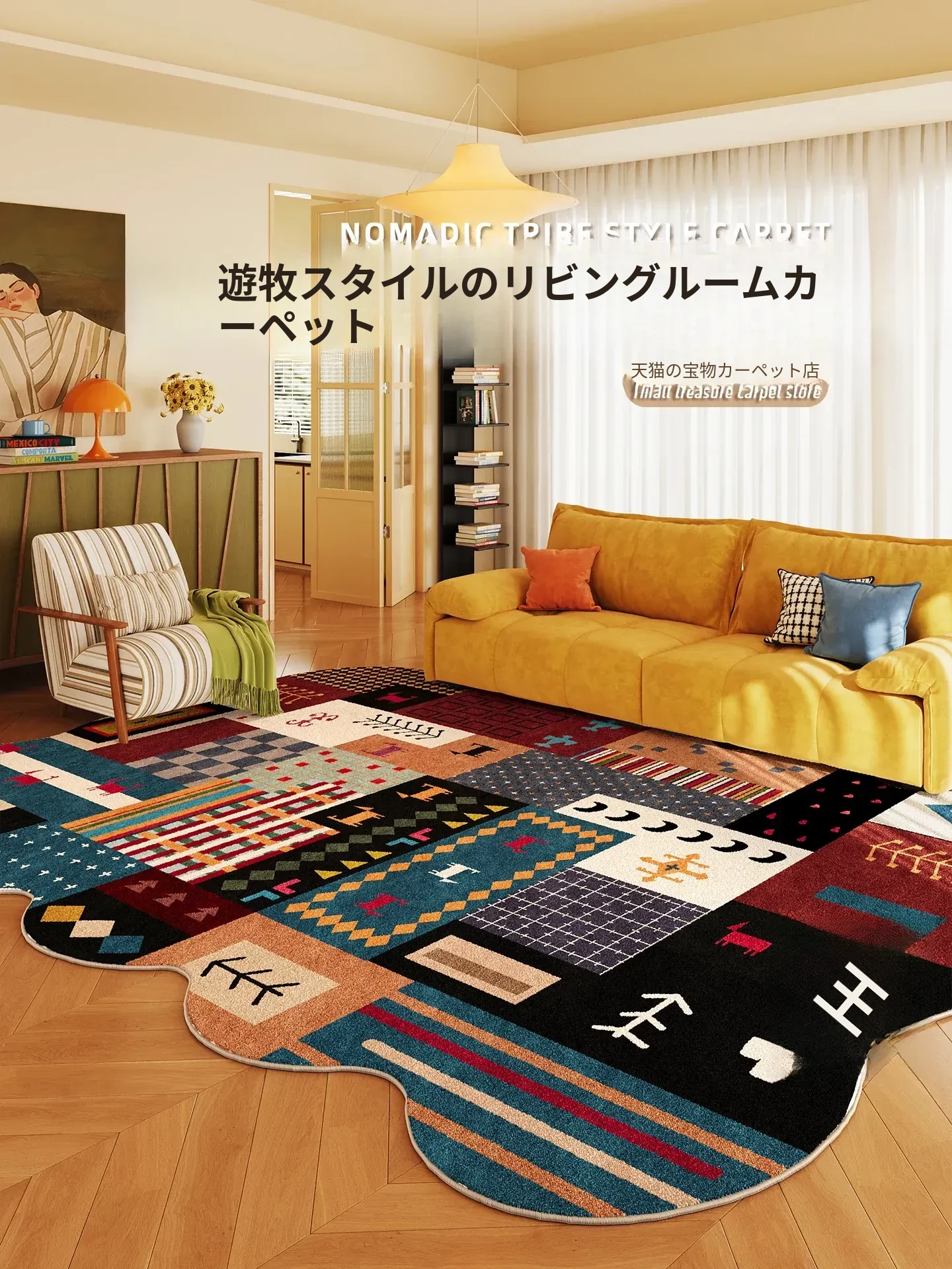 ヴィンテージ風異形リビングカーペット ソファマット シープスキン ベッドサイドマット レトロスタイル お手入れ簡単 脚元をおしゃれに演出