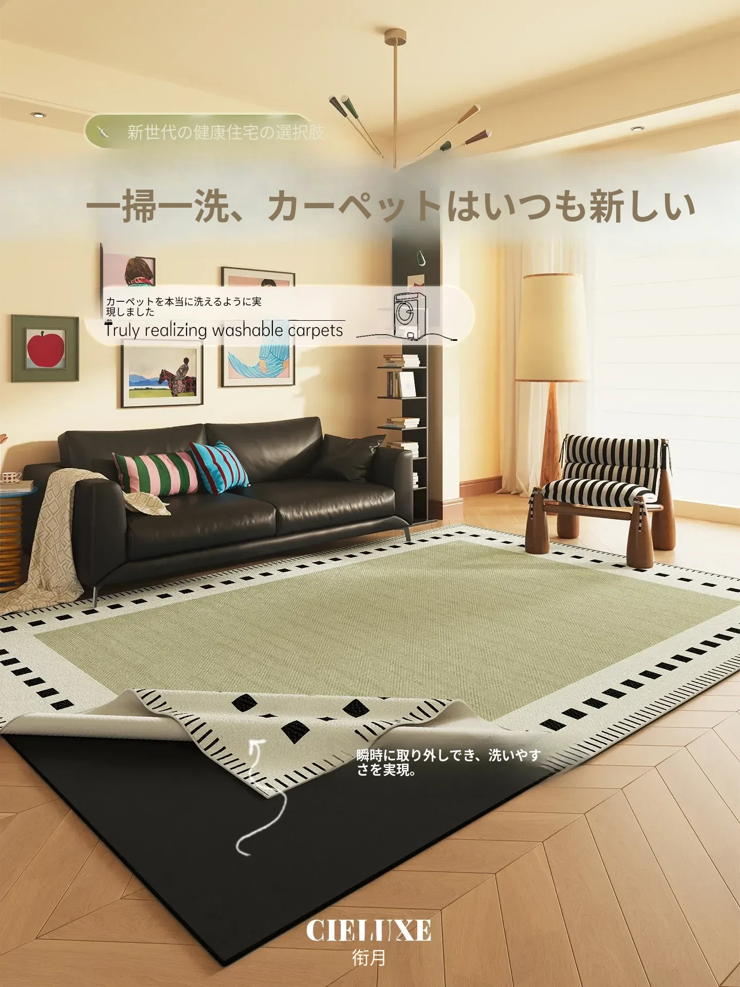 フレンチスタイルのリビング用カーペット、洗えるレトログリーンのフワフワラグ。二重層デザインで取り外し可能、心温まる部屋作りに最適!