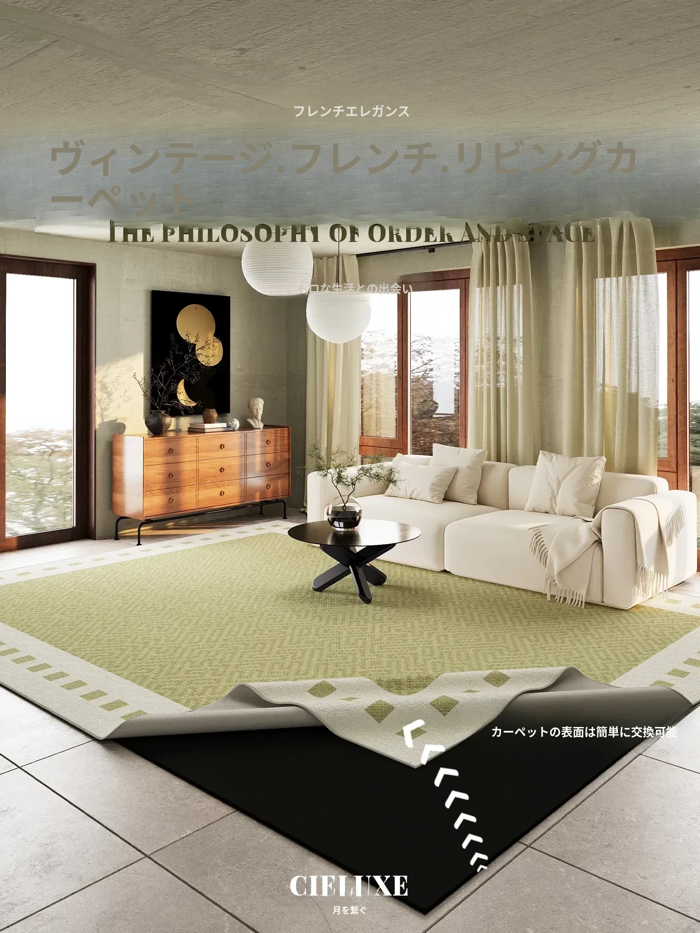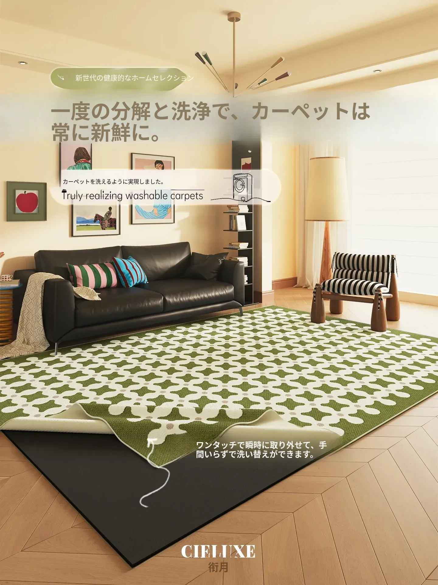 洗えるグリーンカーペット!フレンチソファにぴったりなレトロデザインの二重構造。寝室やリビングのベッドサイドに最適で、お手入れも簡単。おしゃれで機能的な空間を演出します!