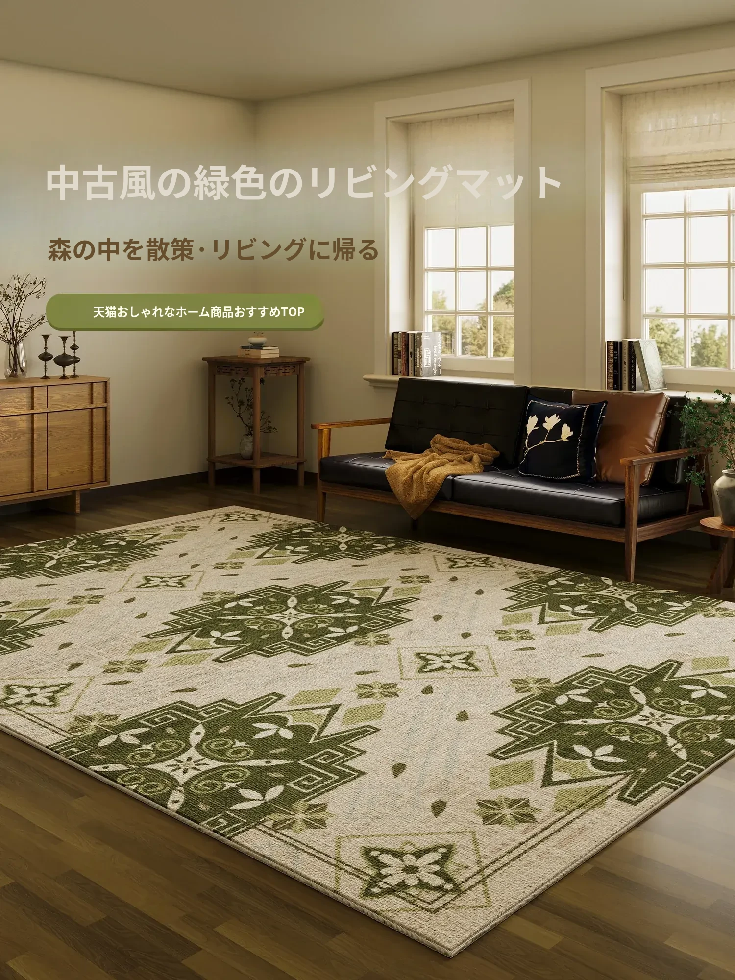 ヴィンテージ風カーペット!寝室やリビングにぴったりなレトログリーンのソファマット。ペルシャデザインで防水・防汚機能付き。おしゃれで実用的な家用フットマットで、快適な空間を演出します。