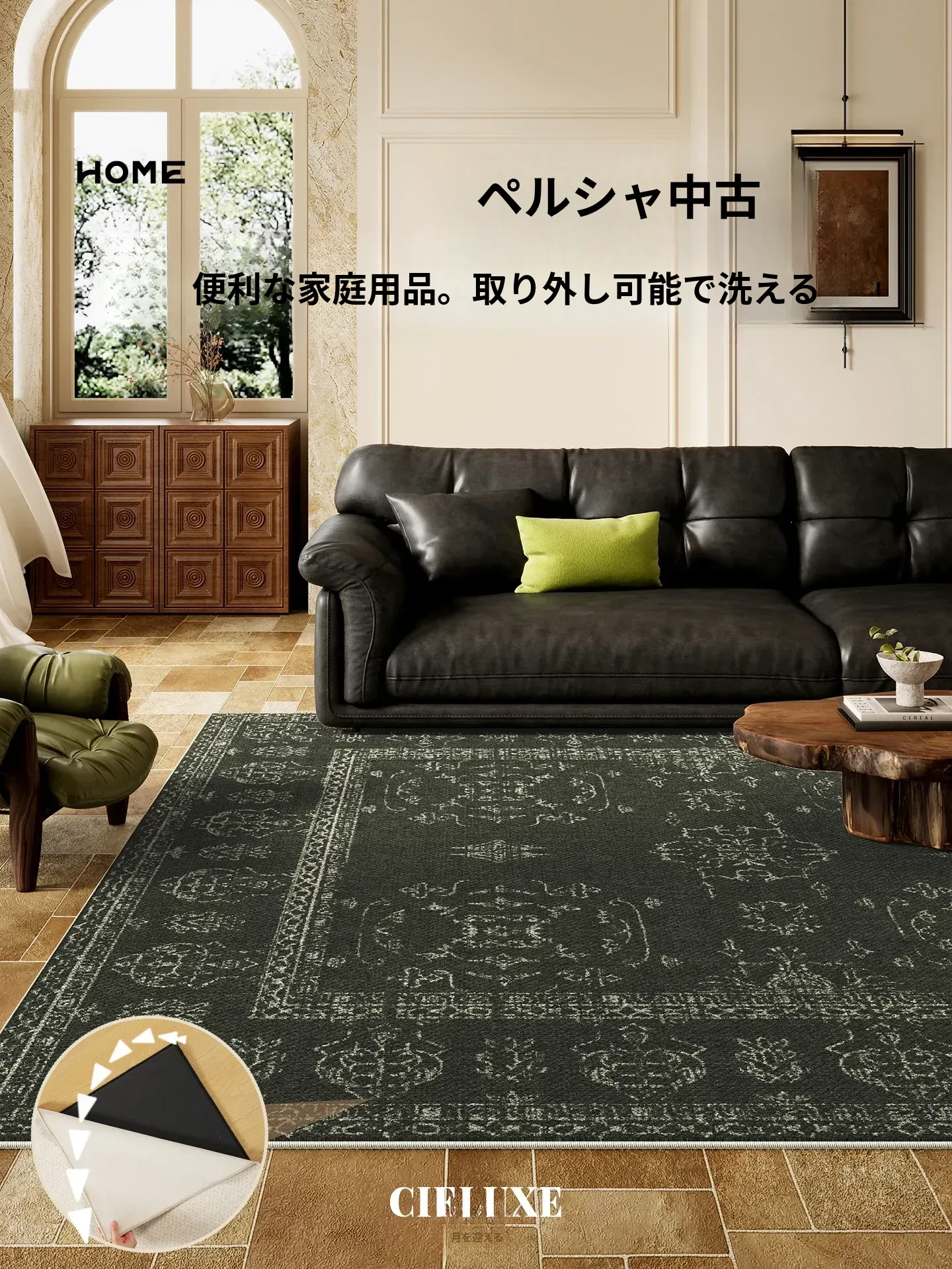 ペルシャ絨毯 リビング用 中古風 デザイン 洗える 着脱可能なマット レトロスタイル グリーン 寝室 ベッドサイドマット で、心地よい空間を演出!お手入れ簡単で、どんなインテリアにもぴったり!
