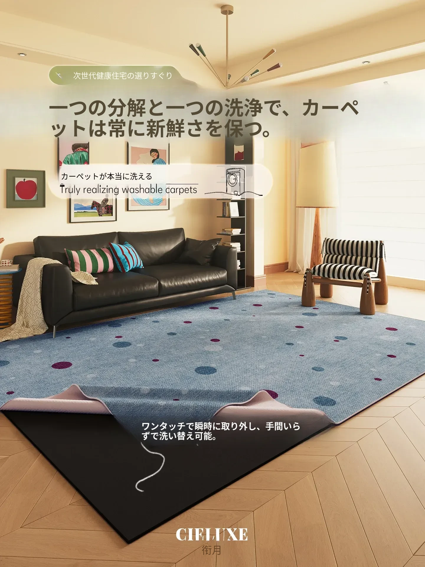北欧風のリビングカーペット|バウハウスソファとコーヒーテーブルにぴったり!洗えるブルーカーペット|寝室のベッドサイドにも最適!おしゃれで機能的な足元を演出します。