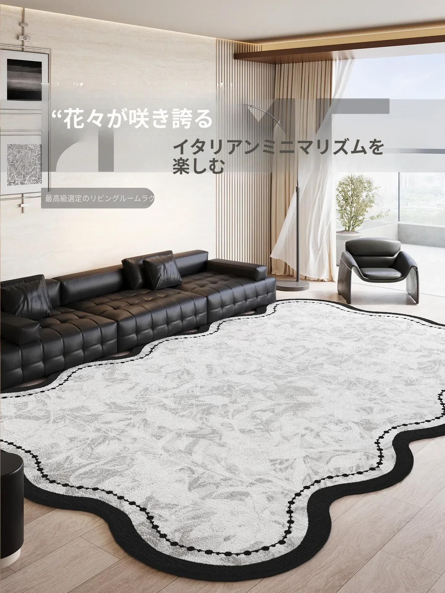 2026年新作!軽奢感あふれる不規則デザインのグレーラグマット。リビングやベッドサイドに最適、洗濯不要でお手入れ簡単!おしゃれなソファマットとしても大活躍!