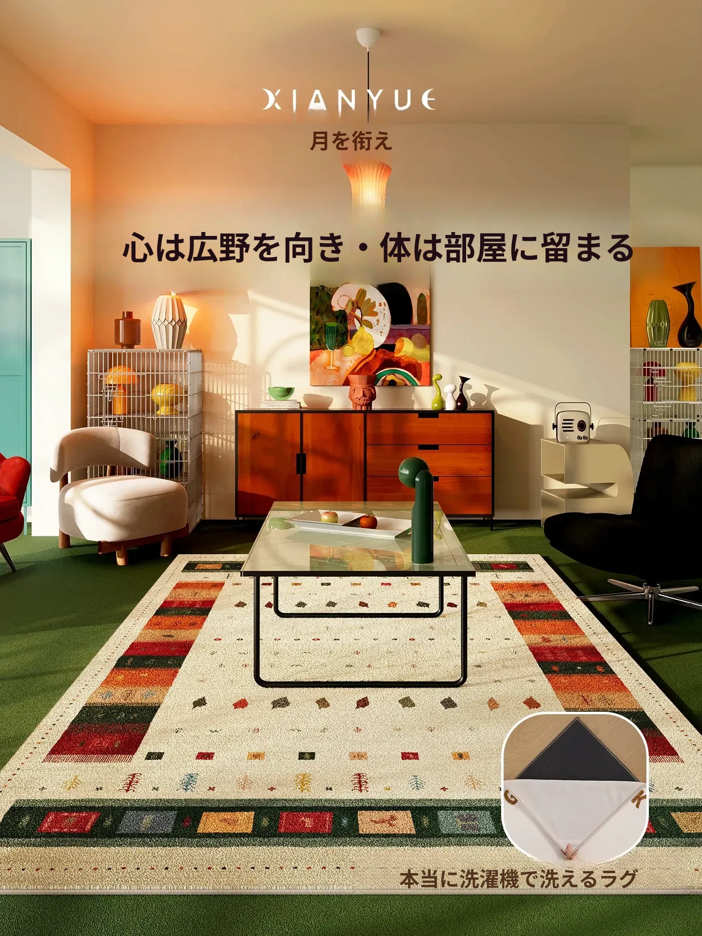 洗えるレトロ風カーペット - リビングソファやベッドサイドにぴったり!おしゃれなデザインで、簡単に取り外し可能。お手入れも楽々、快適な空間を演出します。