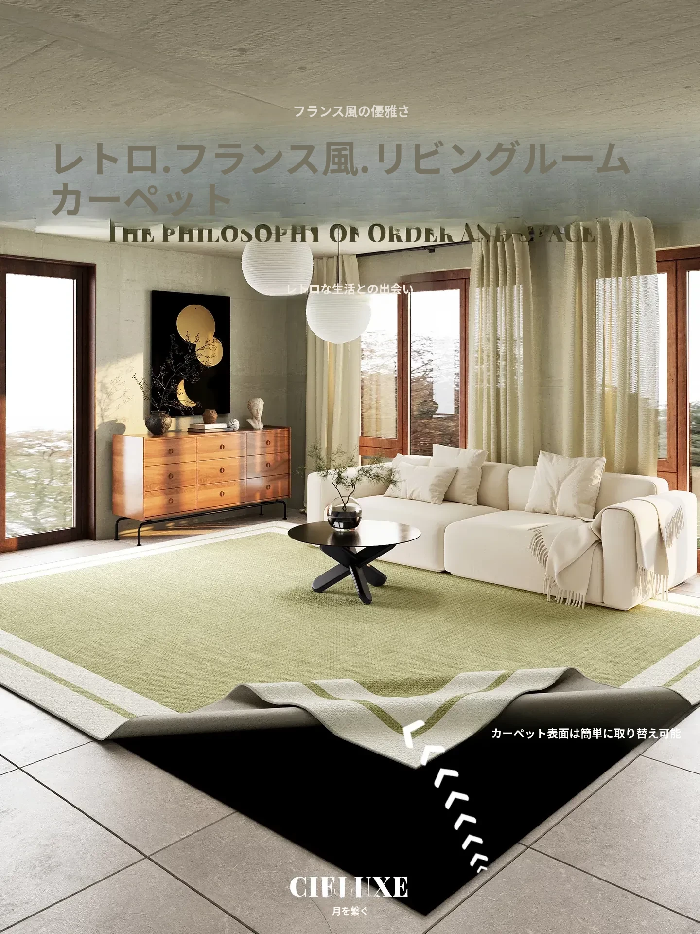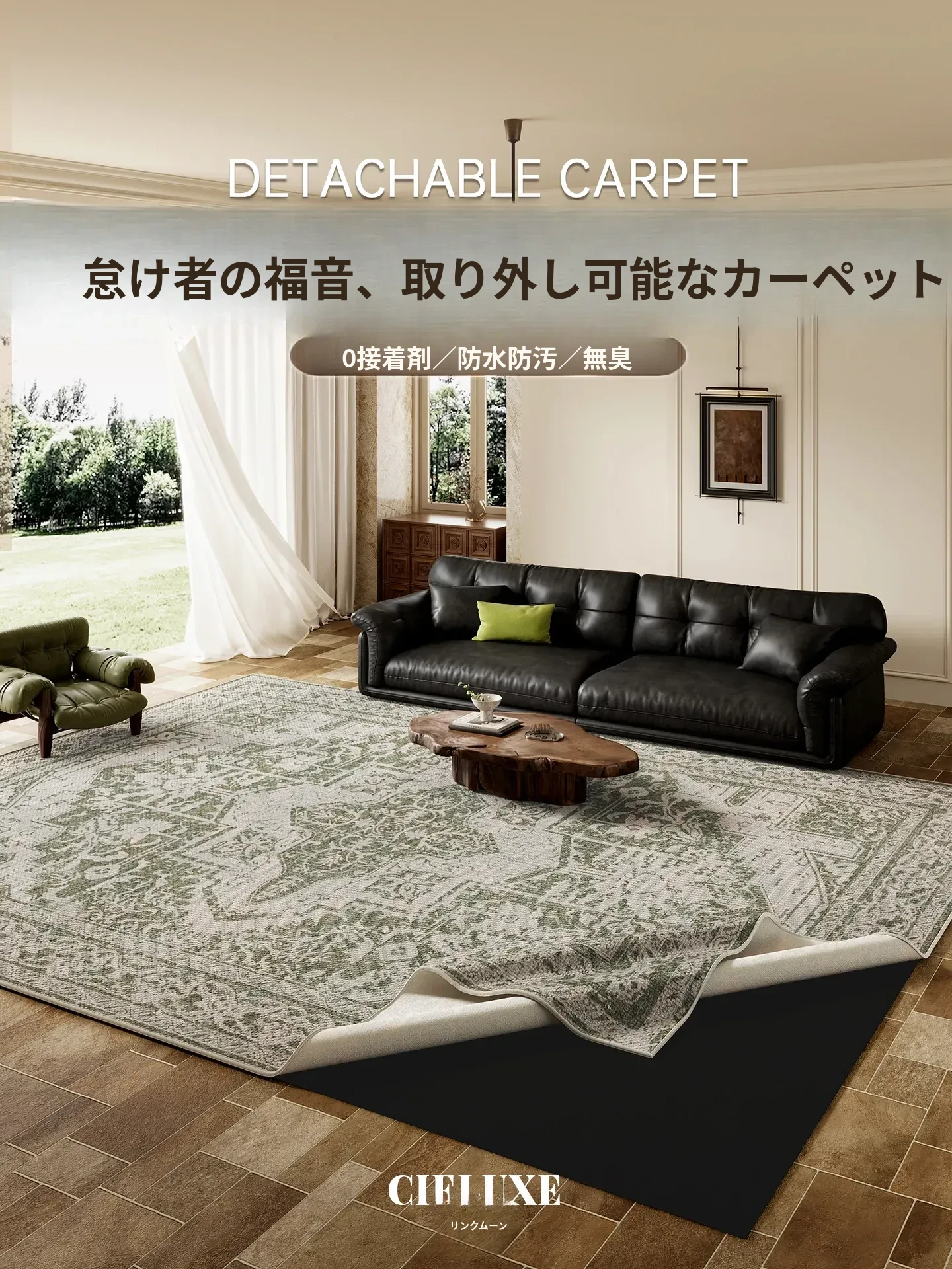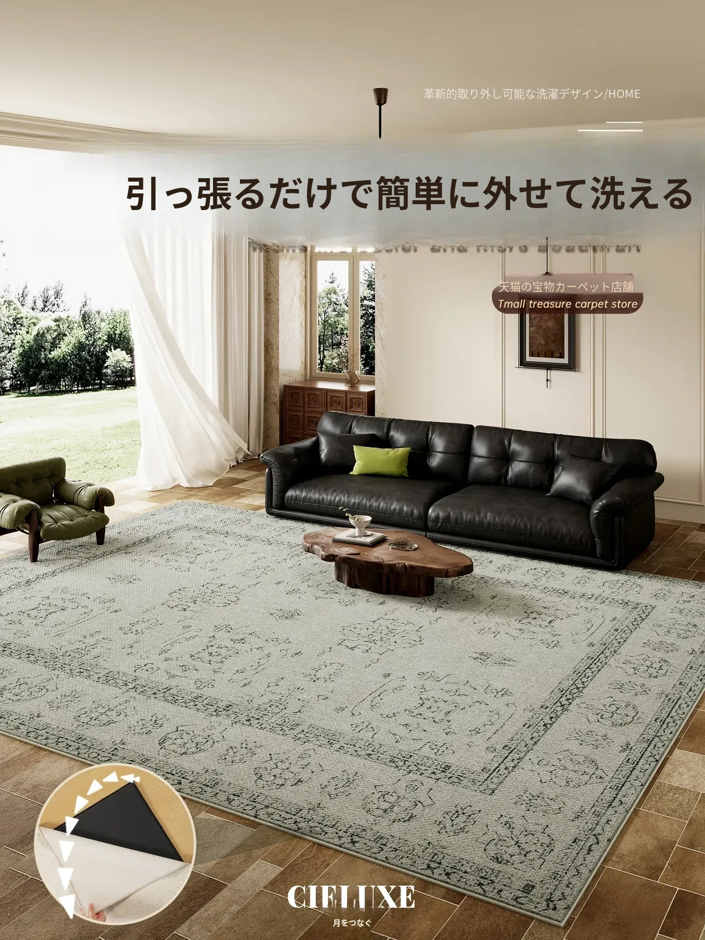 ヴィンテージ風リビングカーペット - ダブルレイヤーで取り外し可能、洗濯機対応!フレンチスタイルのソファにぴったりなレトロなグリーンインテリアマット。お手入れ簡単でお洒落な空間を演出!