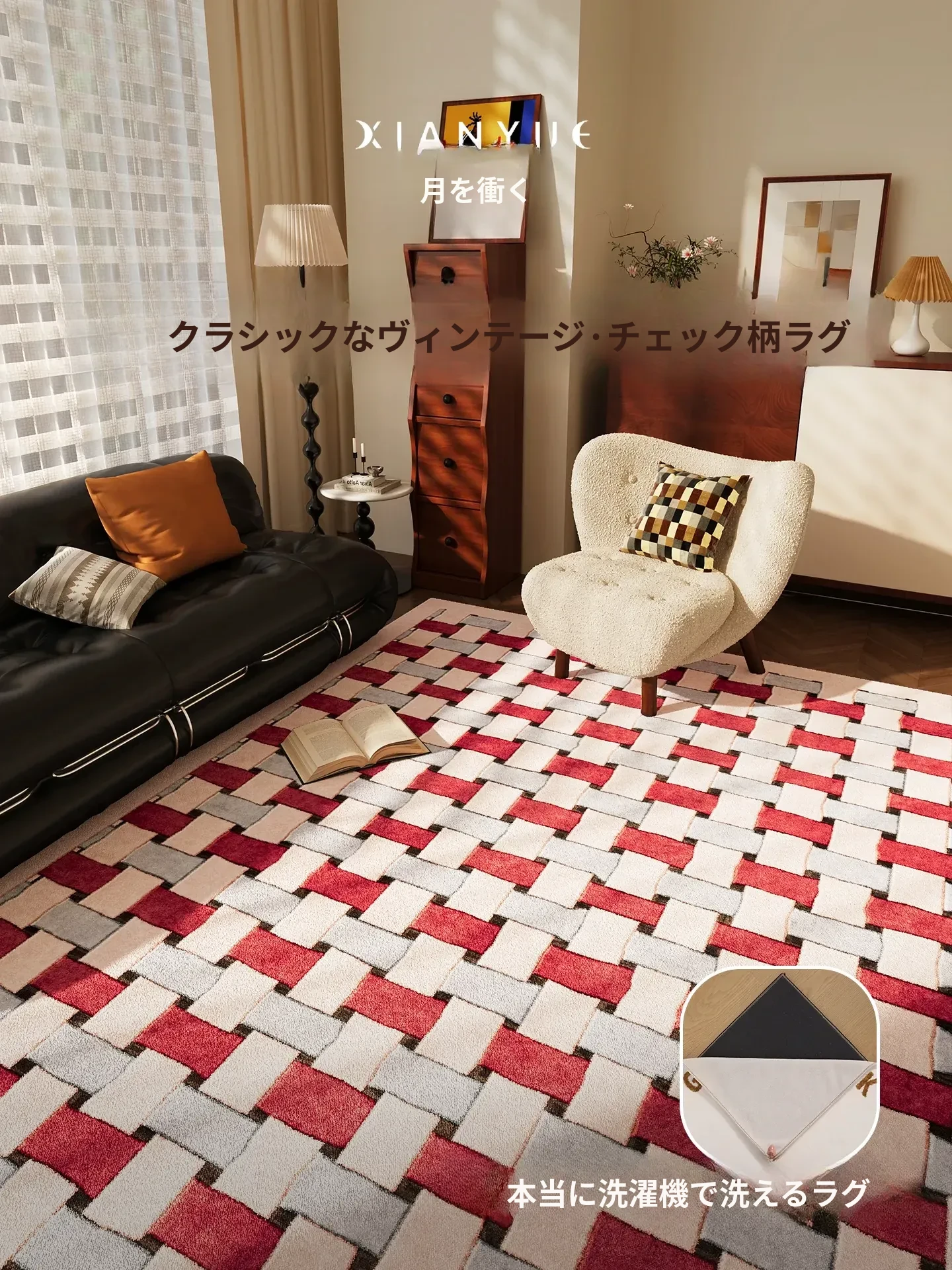 月を衝くバウハウスデザインのラグ!レトロスタイルのリビングソファマット、洗える&取り外し可能、寝室のベッドサイドにも最適なヴィンテージチェック柄。おしゃれで機能的、あなたの空間を引き立てます!