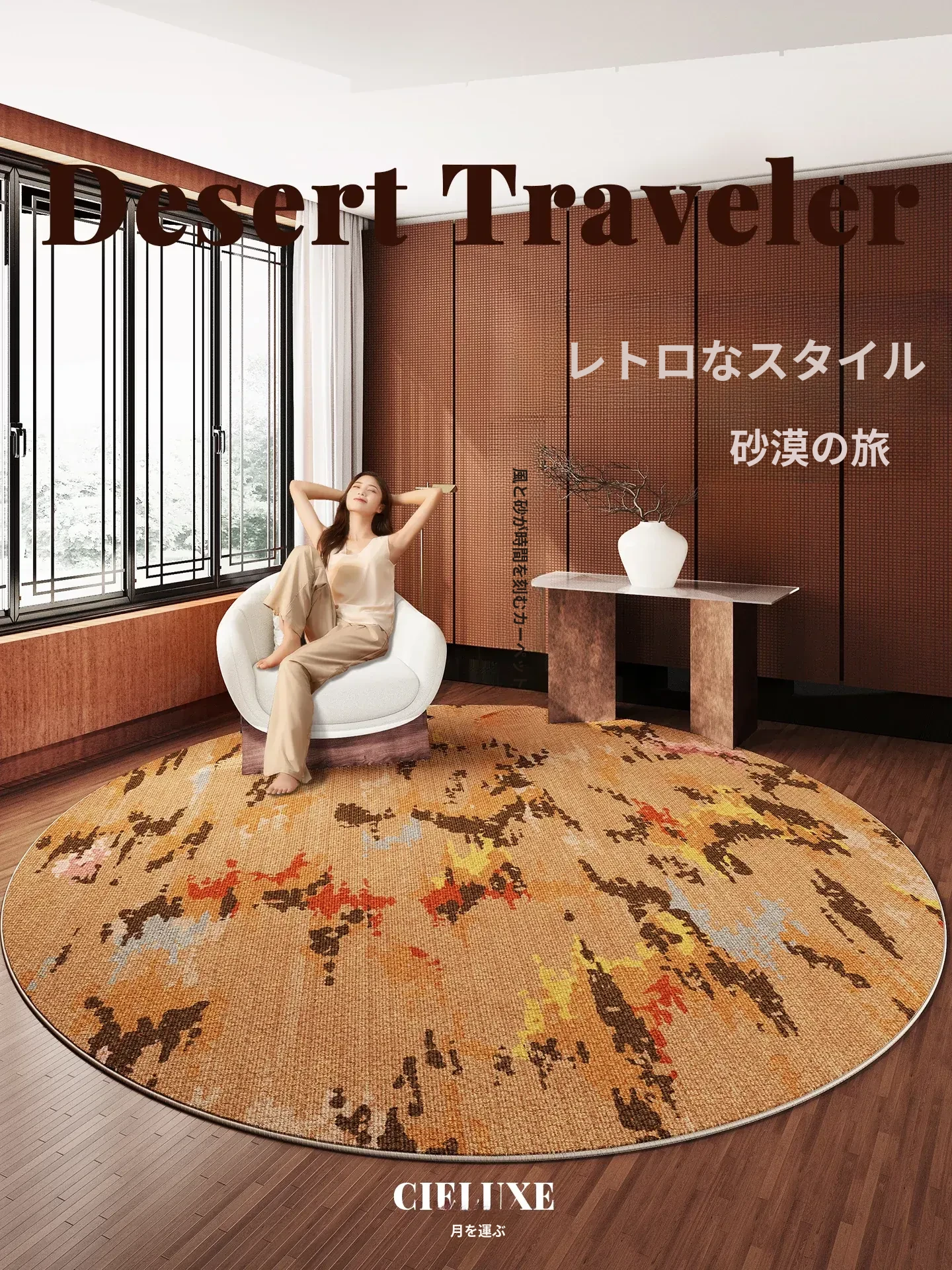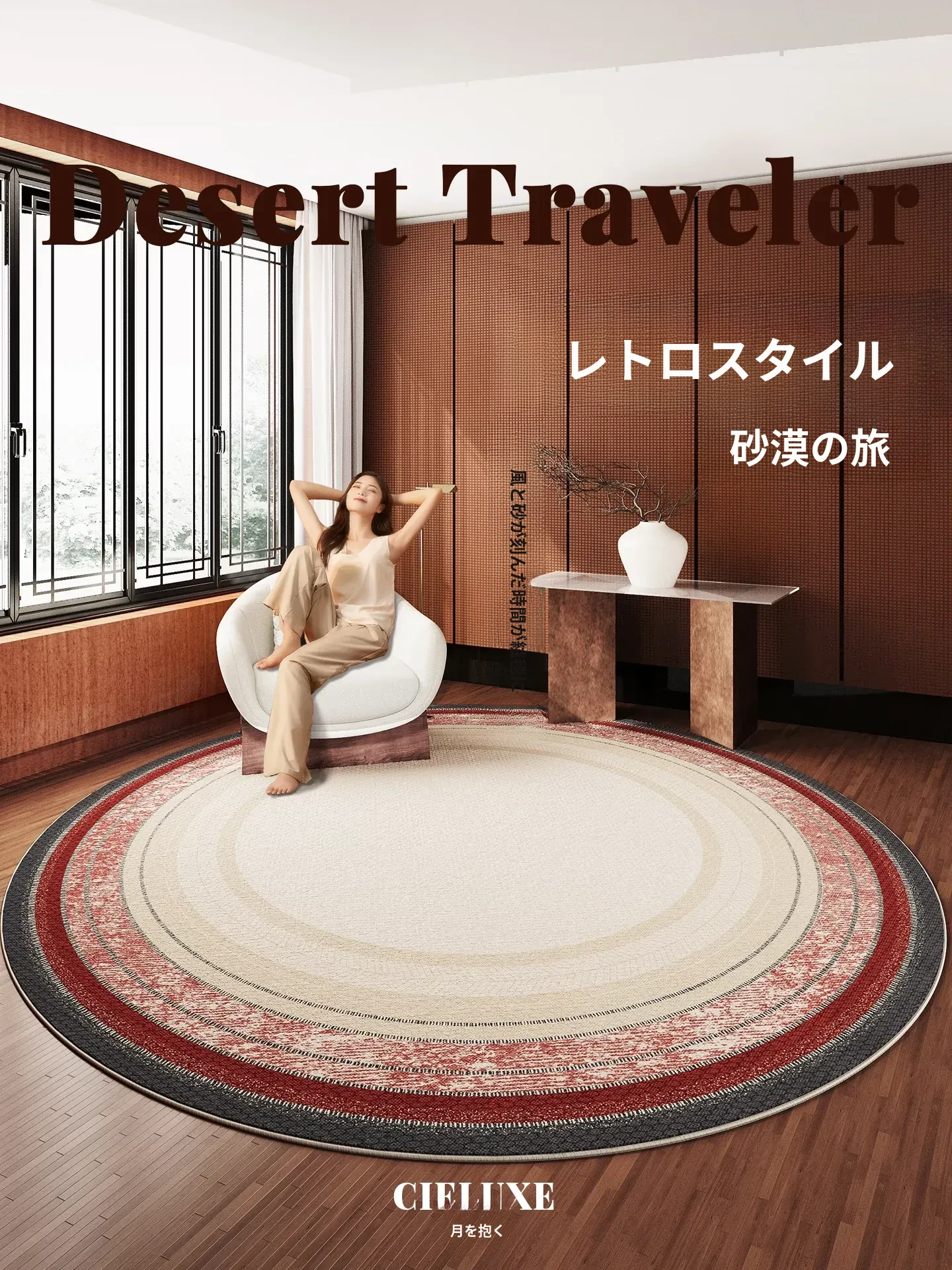 レトロなブラウンのラウンドカーペット - リビングルームや寝室にぴったりな防水ソファマット、ヴィンテージ風のフットマットでお洒落な空間を演出!