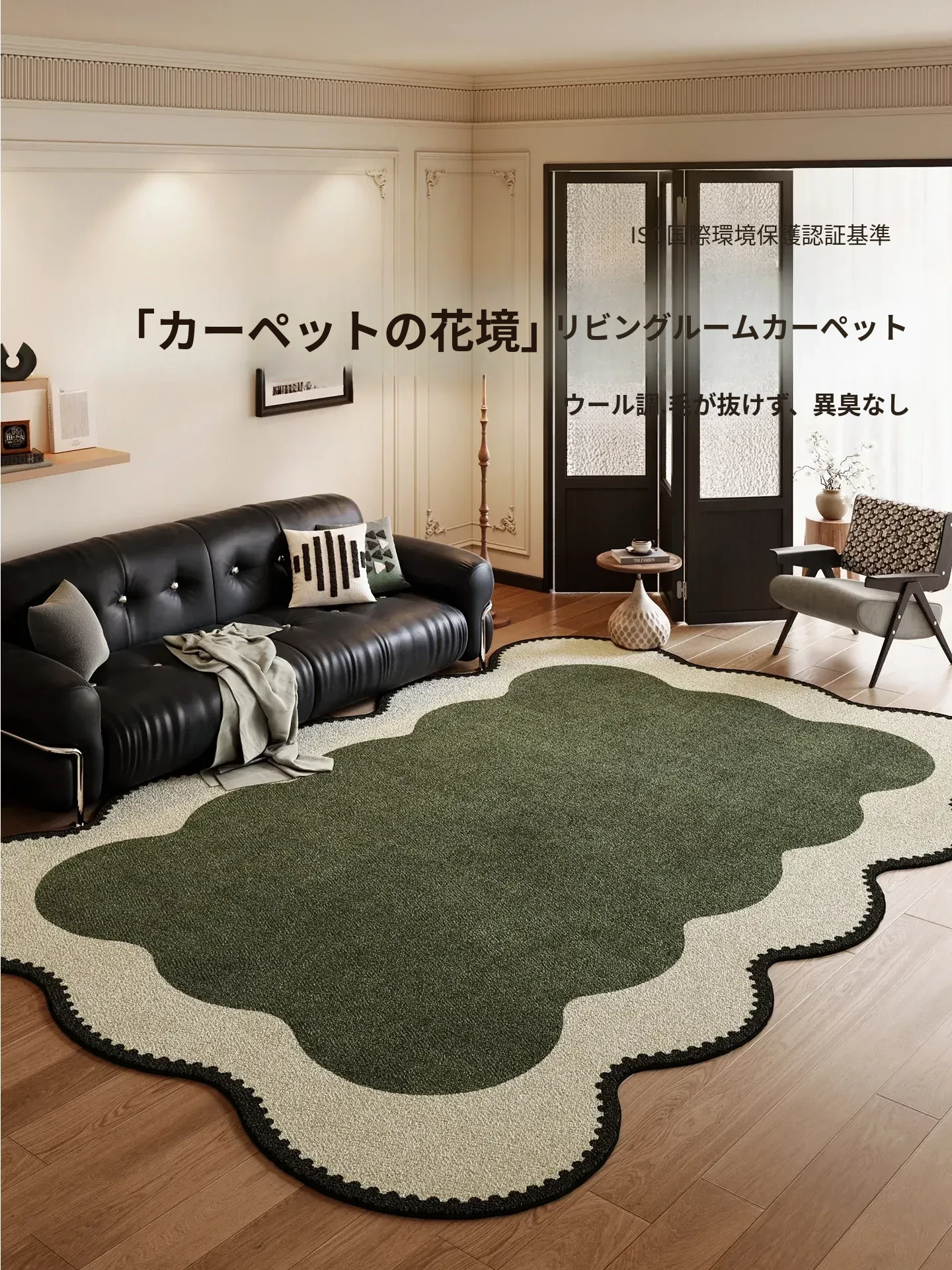 レトログリーンカーペット・ユニークな形のリビングソファマット・アンティーク風・防水・防汚・フレンチスタイルの不規則なベッドサイドマットで、おしゃれな空間を演出!