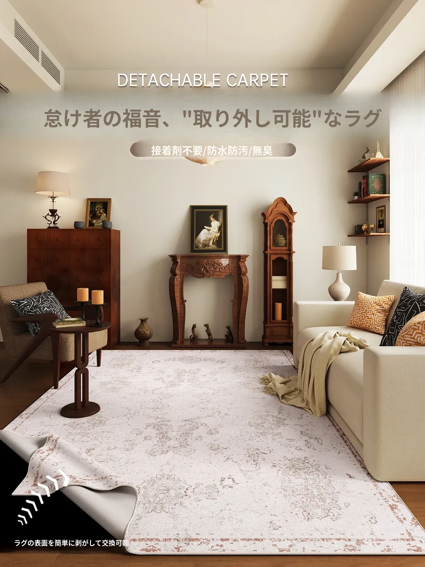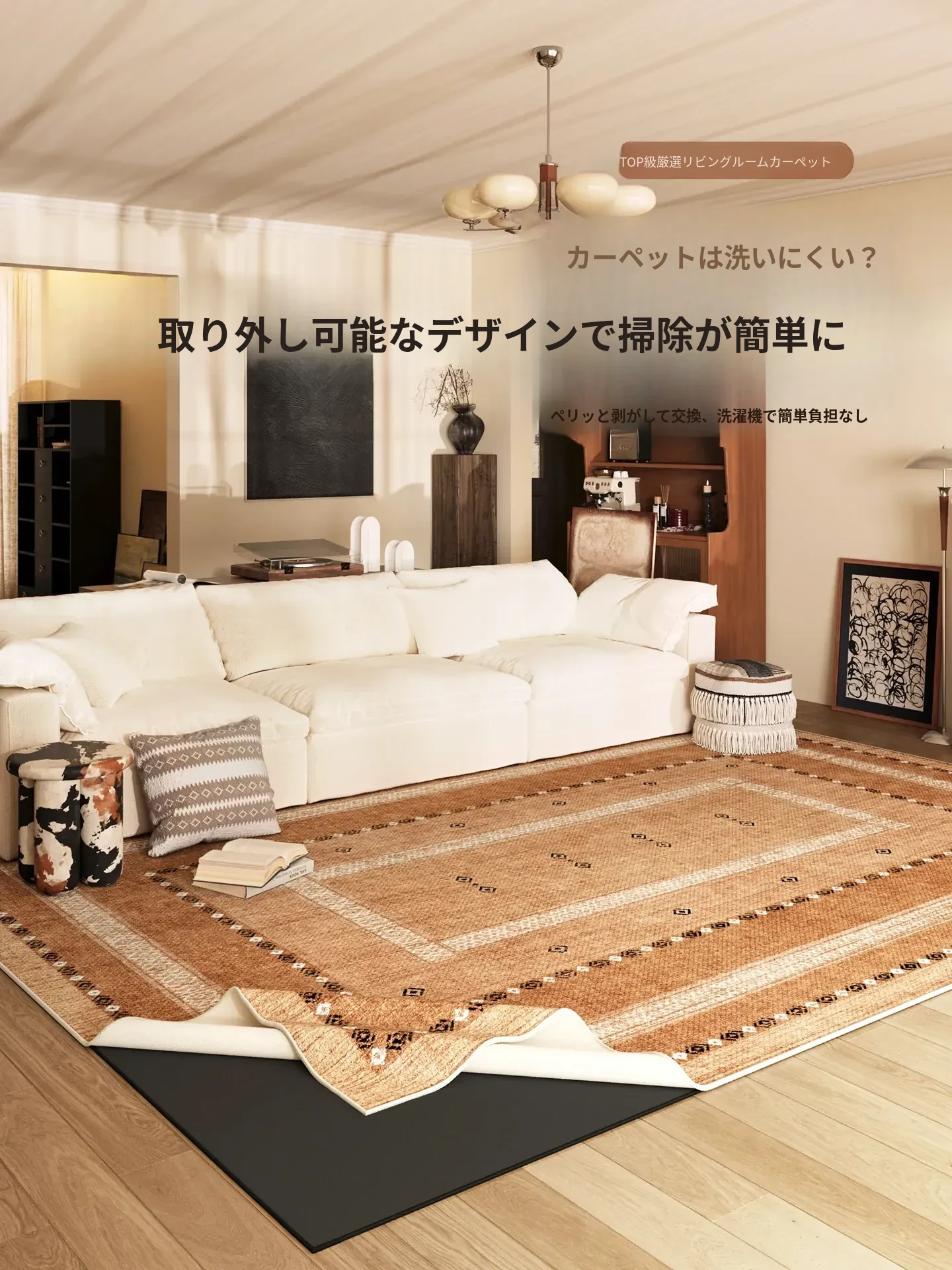 月を衝くリビングスタイルのラグ、洗えるソファ用フワフワマット!ヴィンテージ風の2層デザイン、取り外し可能でお手入れ簡単。おしゃれな足元を彩る、こだわりの一品です。