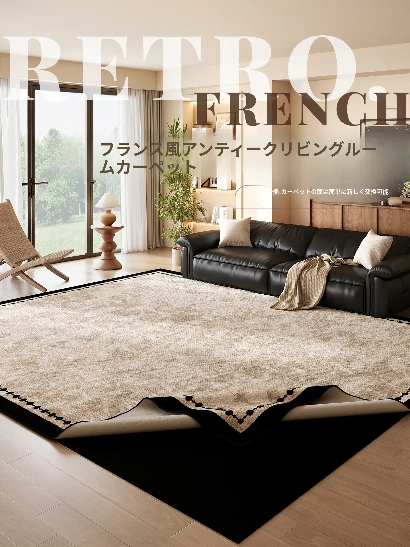 フレンチスタイルの洗える2層ラグ - おしゃれな中古風のリビング用ソファマット、取り外し可能で寝室のベッドサイドにも最適!お手入れ簡単、快適な空間を演出します。