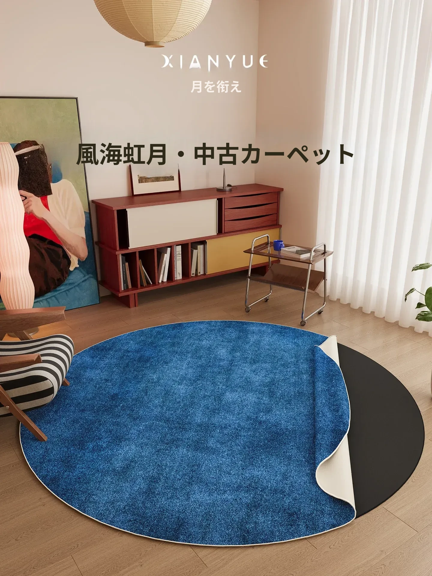 月の光を映すブルーラグ - 丸型・洗える・レトロデザインの2重構造、ベッドサイドにぴったりの便利なフロアマット!ヴィンテージ感漂う中古風の魅力で、あなたの寝室を特別な空間に。