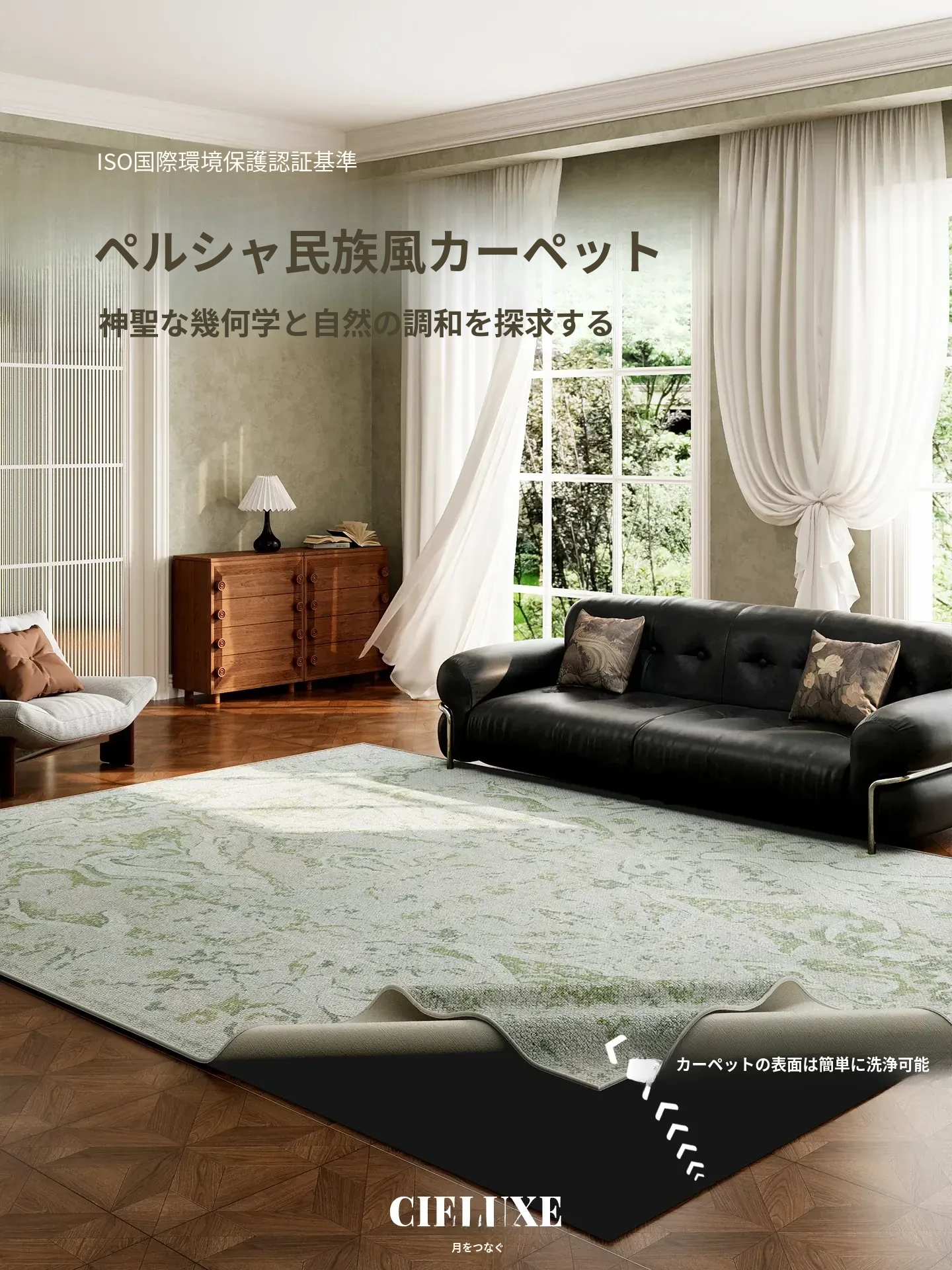 民族風デザインの洗えるカーペット!取り外し可能で機械洗い可能なレトログリーンの高級感あふれる防水・防汚フロアマット。お部屋をおしゃれに演出しながら、お手入れも簡単!