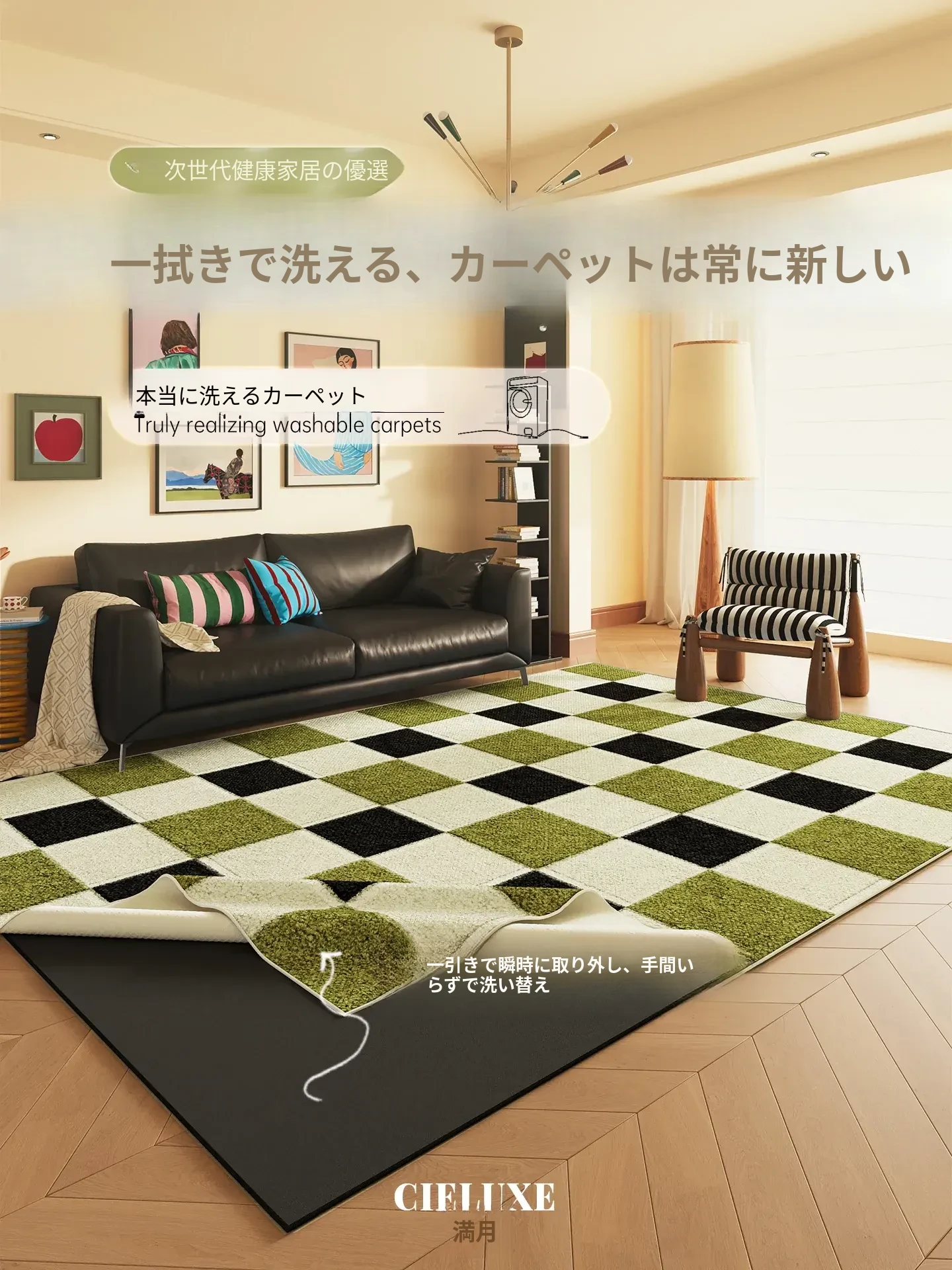 洗える!レトロなグリーンチェック柄の2層構造ソファマット。おしゃれで機能的なリビング用カーペット、簡単に取り外し可能!家庭にぴったりな足元を彩るアイテムです。